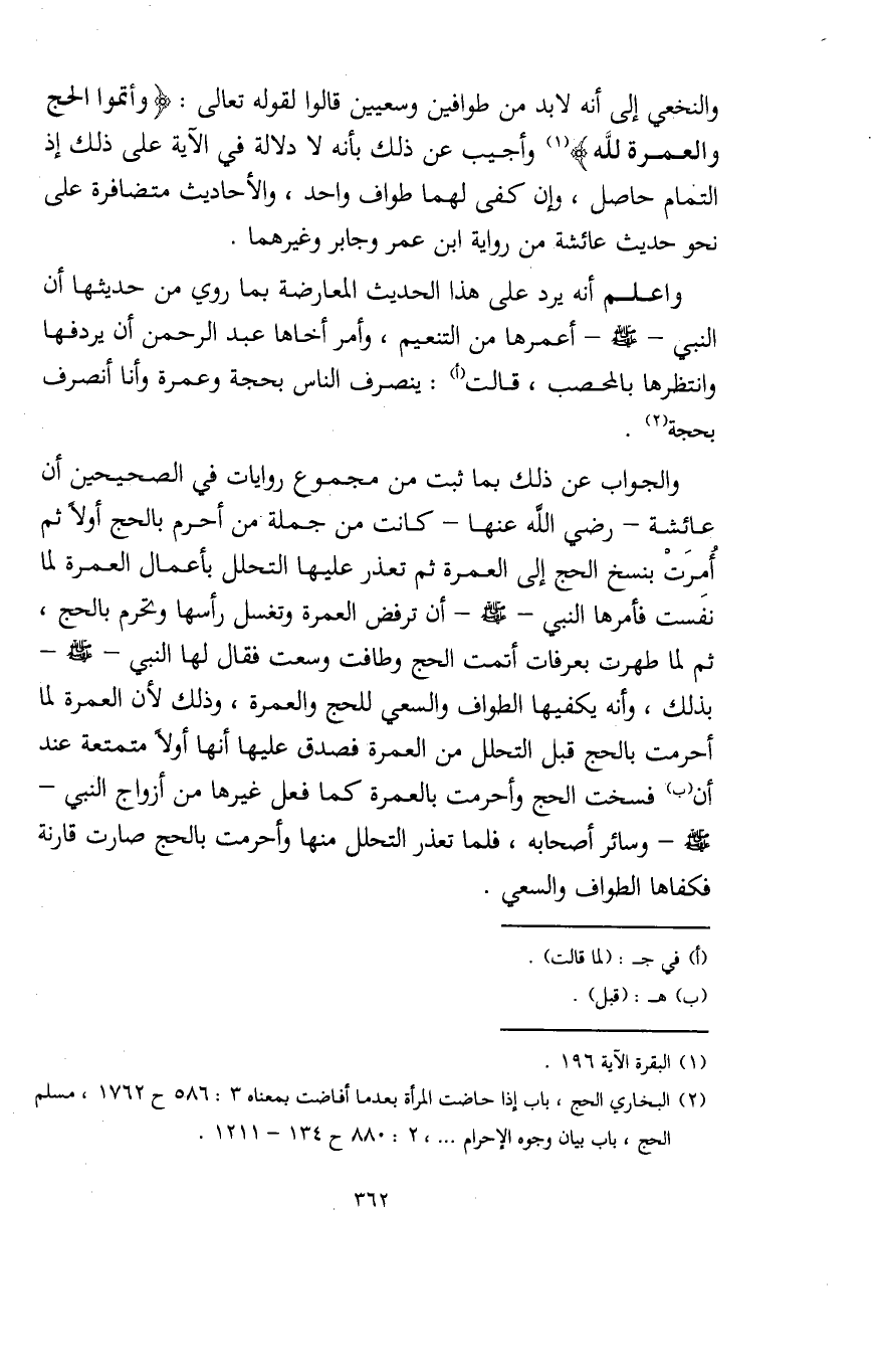 (¬2) البخاري الحج، باب إذا حاضت المرأة بعدما أفاضت بمعناه 3: 586 ح 1762، مسلم الحج، باب بيان وجوه الإحرام. . . .، 2: 880 ح 134 - 1211.