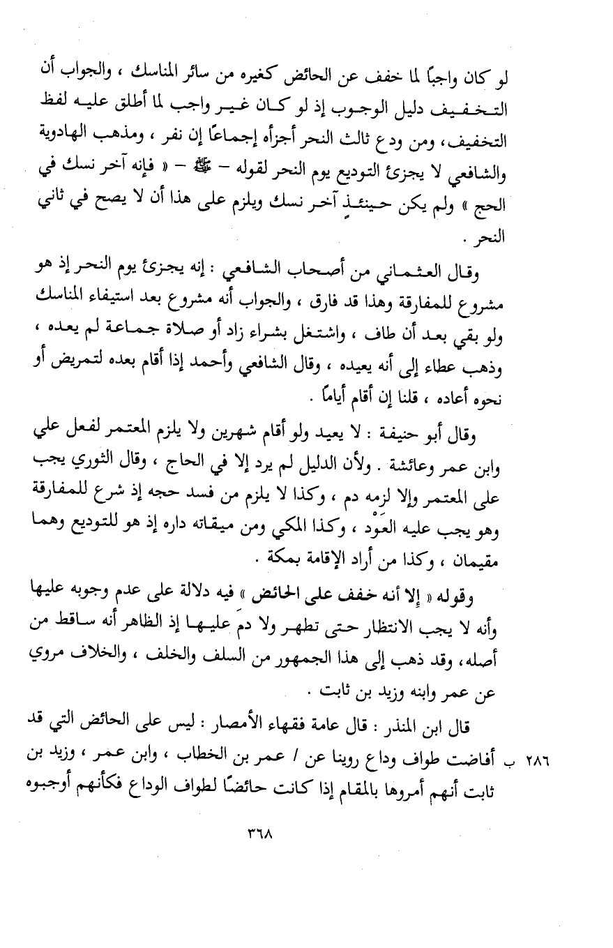 قال ابن المنذر: قال عامة فقهاء الأمصار: ليس على الحائض التي قد أفاضت طواف وداع روينا عن عمر بن الخطاب، وابن عمر، وزيد بن ثابت أنهم أمروها بالمقام إذا كانت حائضًا لطواف الوداع فكأنهم أوجبوه