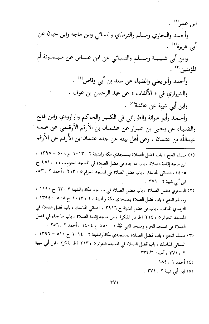 (¬1) مسلم الحج، باب فضل الصلاة بمسجدي مكة والمدينة 2: 1013 ح 509 - 1395، ابن ماجه إقامة الصلاة، باب ما جاء في فضل الصلاة في المسجد الحرام. . . .، 1: 451 ح 1405، النسائي المناسك، باب فضل الصلاة في المسجد الحرام 5: 213، أحمد 2: 53، ابن أبي شيبة 2: 371.