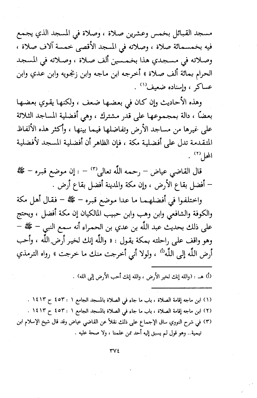 وهذه الأحاديث وإن كان في بعضها ضعف، ولكنها يقوي بعضها بعضًا، دالة بمجموعها على قدر مشترك، وهي أفضلية المساجد الثلاثة على غيرها من مساجد الأرض وتفاضلها فيما بينها، وأكثر هذه الألفاظ المتقدمة تدل على أفضلية مكة، فإن الظاهر أن أفضلية المسجد لأفضلية المحل (¬2).