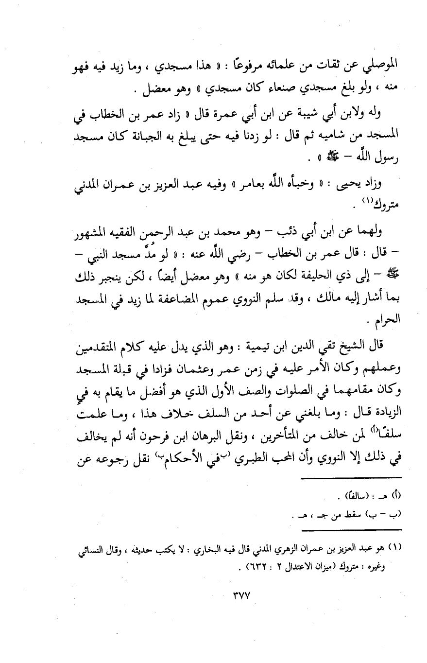 قال الشيخ تقي الدين بن تيمية: وهو الذي يدل عليه كلام المتقدمين وعملهم وكان الأمر عليه في زمن عمر وعثمان فزادا في قبلة المسجد وكان مقامهما في الصلوات والصف الأول الذي هو أفضل ما يقام به في الزيادة قال: وما بلغني عن أحد من السلف خلاف هذا، وما علمت سلفًا (أ) لمن خالف من المتأخرين، ونقل البرهان ابن فرحون أنه لم يخالف في ذلك إلا النووي وأن المحب الطبري (ب في الأحكام ب) نقل رجوعه عن