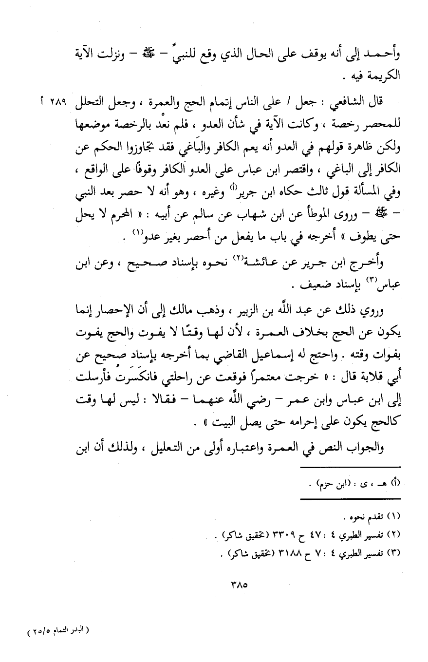 قال الشافعي: جعل على الناس إتمام الحج والعمرة، وجعل التحلل للمحصر رخصة، وكانت الآية في شأن العدو، فلم نعد بالرخصة موضعها ولكن ظاهرة قولهم في العدو أنه يعم الكافر والبَاغي فقد تجاوزوا الحكم عن الكافر إلى الباغي، واقتصر ابن عباس على العدو الكافر وقوفًا على الواقع، وفي المسألة قول ثالث حكاه ابن جرير (أ) وغيره، وهو أنه لا حصر بعد النبي - صلى الله عليه وسلم - وروى الموطأ عن ابن شهاب عن سالم عن أبيه: "المحرم لا يحل حتى يطوف" أخرجه في باب ما يفعل من أحصر بغير عدو (¬1).