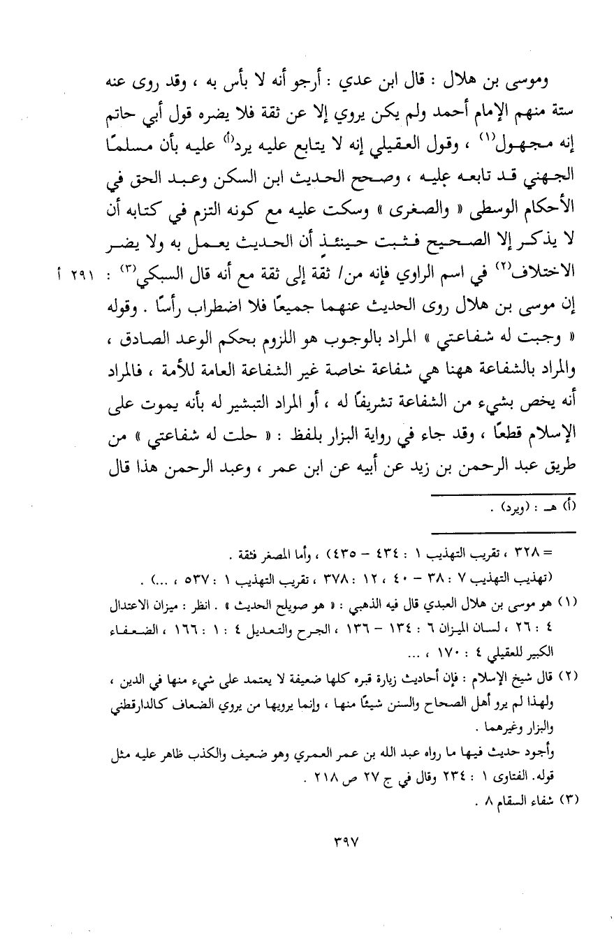 وموسى بن هلال: قال ابن عدي: أرجو أنه لا بأس به، وقد روى عنه ستة منهم الإمام أحمد ولم يكن يروي إلا عن ثقة فلا يضره قول أبي حاتم إنه مجهول (¬1)، وقول العقيلي إنه لا يتابع عليه يرد (أ) عليه بأن مسلمًا الجهني قد تابعه عليه، وصحح الحديث ابن السكن وعبد الحق في الأحكام الوسطى "والصغرى" وسكت عليه مع كونه التزم في كتابه أن لا يذكر إلا الصحيح فثبت حينئذٍ أن الحديث يعمل به ولا يضر الاختلاف (¬2) في اسم الراوي فإنه من لم ثقة إلى ثقة مع أنه قال السبكي (¬3): إن موسى بن هلال روى الحديث عنهما جميعًا فلا اضطراب رأسًا. وقوله "وجبت له شفاعتي" المراد بالوجوب هو اللزوم بحكم الوعد الصادق، والمراد بالشفاعة ها هنا هي شفاعة خاصة غير الشفاعة العامة للأمة، فالمراد أنه يخص بشيء من الشفاعة تشريفًا له، أو المراد التبشير له بأنه يموت على الإسلام قطعًا، وقد جاء في رواية البزار بلفظ: "حلت له شفاعتي" من طريق عبد الرحمن بن زيد عن أبيه عن ابن عمر، وعبد الرحمن هذا قال