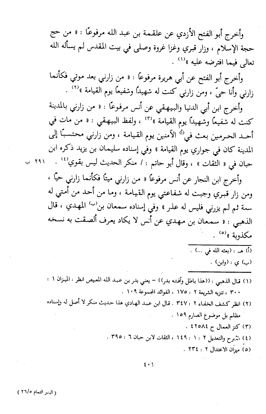 وأخرج ابن النجار عن أنس مرفوعًا "من زارني ميتًا فكأنما زارني حيًّا، ومن زار قبري وجبت له شفاعتي يوم القيامة، وما من أحد من أمتي له سمة ثم لم يزرني فليس له عذر" وفي إسناده سمعان بن (ب) المهدي، قال الذهبي: "سمعان بن مهدي عن أنس لا يكاد يعرف ألصقت به نسخه مكذوبة" (¬5).