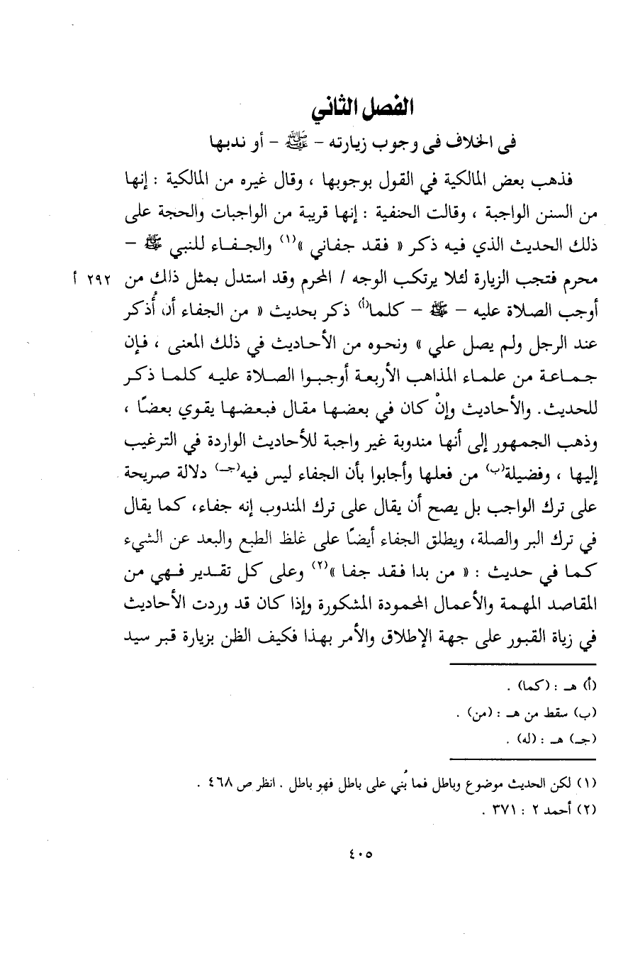 فذهب بعض المالكية في القول بوجوبها، وقال غيره من المالكية: إنها من السنن الواجبة، وقالت الحنفية: إنها قريبة من الواجبات والحجة على ذلك الحديث الذي فيه ذكر "فقد جفاني" (¬1) والجفاء للنبي - صلى الله عليه وسلم - محرم فتجب الزيارة لئلا يرتكب الوجه المحرم وقد استدل بمثل ذلك من أوجب الصلاة عليه - صلى الله عليه وسلم - كلما (أ) ذكر بحديث "من الجفاء أن أُذكر عند الرجل ولم يصل علي" ونحوه من الأحاديث في ذلك المعنى، فإن جماعة من علماء المذاهب الأربعة أوجبوا الصلاة عليه كلما ذكر للحديث. والأحاديث وإنْ كان في بعضها مقال فبعضها يقوي بعضًا، وذهب الجمهور إلى أنها مندوبة غير واجبة للأحاديث الواردة في الترغيب إليها، وفضيلة (ب) من فعلها وأجابوا بأن الجفاء ليس فيه (جـ) دلالة صريحة على ترك الواجب بل يصح أن يقال على ترك المندوب إنه جفاء، كما يقال في ترك البر والصلة، ويطلق الجفاء أيضًا على غلظ الطبع والبعد عن الشيء كما في حديث: "من بدا فقد جفا" (¬2) وعلى كل تقدير فهي من المقاصد المهمة والأعمال المحمودة المشكورة وإذا كان قد وردت الأحاديث في زياة القبور على جهة الإطلاق والأمر بهذا فكيف الظن بزيارة قبر سيد