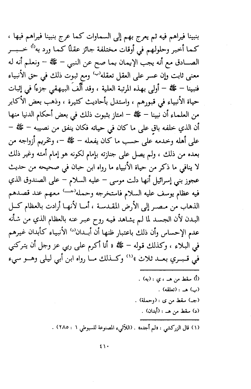 بنبينا فيراهم فيه ثم يعرج بهم إلى السماوات كما عرج بنبينا فيراهم فيها، كما أخبر وحلولهم في أوقات مختلفة جائز عقلًا كما ورد به (أ) خبر الصادق مع أنه يجب الإيمان بما صح عن النبي - صلى الله عليه وسلم - ونعلم أنه له معنى ثابت وإن عسر على العقل تعقله (ب) ومع ثبوت ذلك في حق الأنبياء فنبينا - صلى الله عليه وسلم - أولى بهذه المرتبة العلية، وقد ألَّفَ البيهقي جزءًا في إثبات حياة الأنبياء في قبورهم، واستدل بأحاديث كثيرة، وذهب بعض الأكابر من العلماء أن نبينا - صلى الله عليه وسلم - امتاز بثبوت ذلك في بعض أحكام الدنيا منها أن الذي خلفه باقٍ على ما كان في حياته فكان ينفق من نصيبه - صلى الله عليه وسلم - على أهله وخدمه على حسب ما كان يفعله - صلى الله عليه وسلم -، وتحريم أزواجه من بعده من ذلك، ولم يصل على جنازته بإمام لكونه هو إمام أمته وغير ذلك لا ينافي ما ذكر من حياة الأنبياء ما رواه ابن حبان في صحيحه من حديث عجوز بني إسرائيل أنها دلت موسى - عليه السلام - على الصندوق الذي فيه عظام يوسف - عليه السلام - فاستخرجه وحمله (جـ) معهم عند قصدهم الذهاب من مصر إلى الأرض المقدسة، أما لأنها أرادت بالعظام كل البدن لأن الجسد لما لم يشاهد فيه روح عبر عنه بالعظام الذي من شأنه عدم الإحساس وأن ذلك باعتبار ظنها أن أبدان (د) الأنبياء كأبدان غيرهم في البلاء، وكذلك قوله - صلى الله عليه وسلم - "أنا أكرم على ربي عزَّ وجلَّ أن يتركني في قبري بعد ثلاث" (¬1) وكذلك ما رواه ابن أبي ليلى وهو سيء