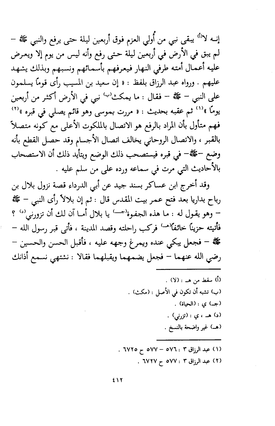 وقد أخرج ابن عساكر بسند جيد عن أبي الدرداء قصة نزول بلال بن رباح بداريا بعد فتح عمر بيت المقدس قال: ثم إن بلالًا رأى النبي - صلى الله عليه وسلم - وهو يقول له: ما هذه الجفوة (جـ) يا بلال أما آن لك أن تزورني (د)؟ فأتيته حزينًا خائفًا (هـ) فركب راحلته وقصد المدينة، فأتى قبر رسول الله - صلى الله عليه وسلم - فجعل يبكي عنده ويمرغ وجهه عليه، فأقبل الحسن والحسين - رضي الله عنهما - فجعل يضمهما ويقبلهما فقالا: نشتهي نسمع أذانك