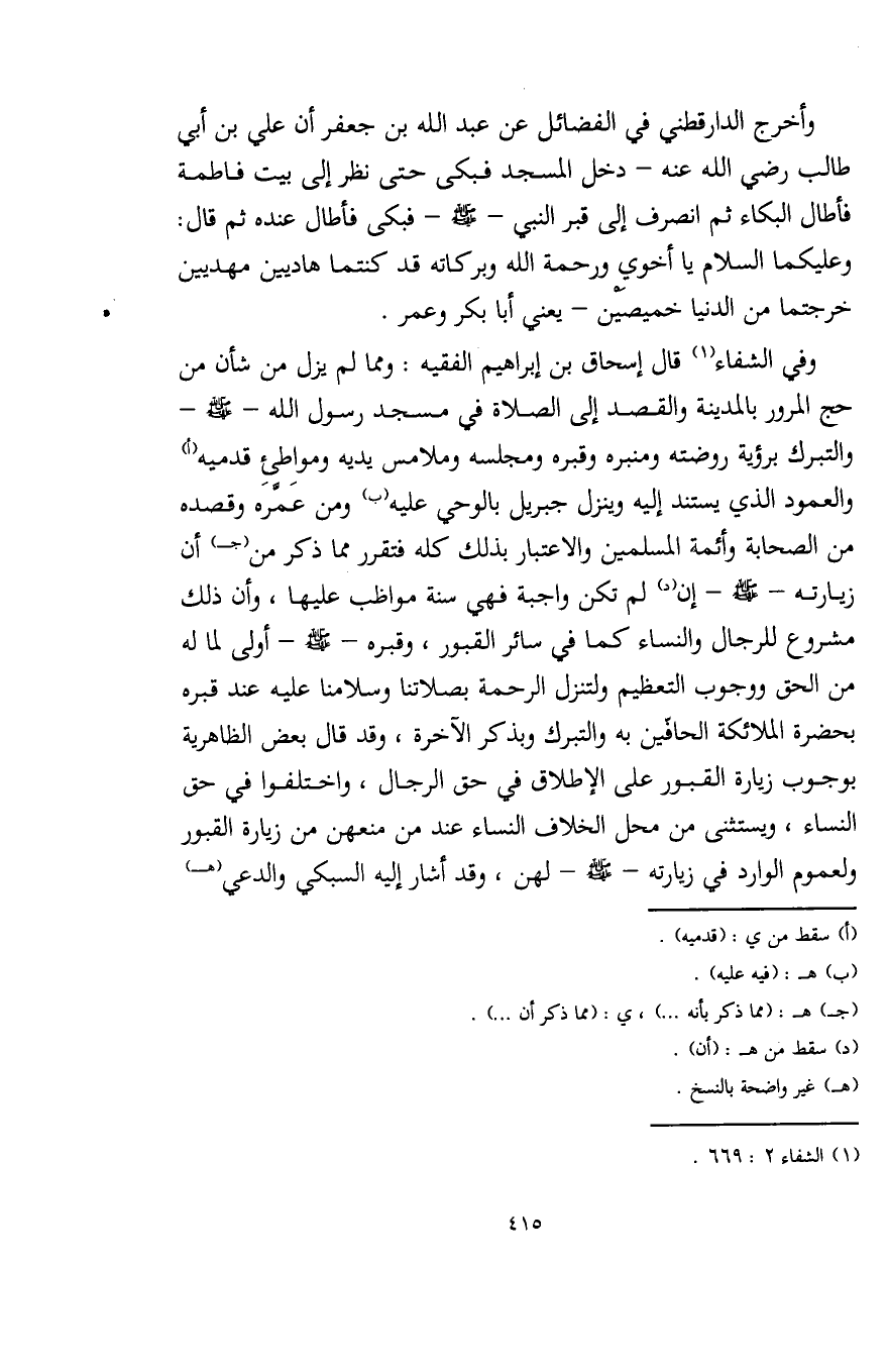 وفي الشفاء (¬1) قال إسحاق بن إبراهيم الفقيه: ومما لم يزل من شأن من حج المرور بالمدينة والقصد إلى الصلاة في مسجد رسول الله - صلى الله عليه وسلم - والتبرك برؤية روضته ومنبره وقبره ومجلسه وملامس يديه ومواطيء قدميه (أ) والعمود الذي يستند إليه وينزل جبريل بالوحي عليه (ب) ومن عَمَّره وقصده من الصحابة وأئمة المسلمين والاعتبار بذلك كله فتقرر مما ذكر من (جـ) أن زيارته - صلى الله عليه وسلم - إن (د) لم تكن واجبة فهي سنة مواظب عليها، وأن ذلك مشروع للرجال والنساء كما في سائر القبور، وقبره - صلى الله عليه وسلم - أولى لما له من الحق ووجوب التعظيم ولتنزل الرحمة بصلاتنا وسلامنا عليه عند قبره بحضرة الملاثكة الحافّين به والتبرك وبذكر الآخرة، وقد قال بعض الظاهرية بوجوب زيارة القبور على الإطلاق في حق الرجال، واختلفوا في حق النساء، ويستثنى من محل الخلاف النساء عند من منعهن من زيارة القبور ولعموم الوارد في زيارته - صلى الله عليه وسلم - لهن، وقد أشار إليه السبكي والدعي (هـ)