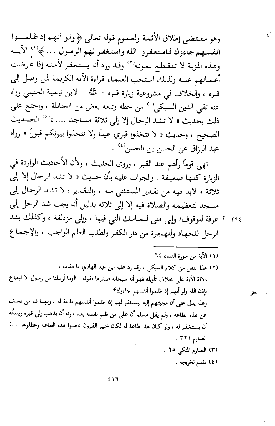 نهى قومًا رآهم عند القبر، وروى الحديث، ولأن الأحاديث الواردة في الزيارة كلها ضعيفة. والجواب عليه بأن حديث "لا تشد الرحال إلا إلى ثلاثة" لا بد فيه من تقدير المستثنى منه، والتقدير: لا تشد الرحال إلى مسجد لتعظيمه والصلاة فيه إلا إلى ثلاثة بدليل أنه يجب شد الرحل إلى عرفة للوقوف وإلى منى للمناسك التي فيها، وإلى مزدلفة، وكذلك يشد الرحل للجهاد وللهجرة من دار الكفر ولطلب العلم الواجب، والإجماع