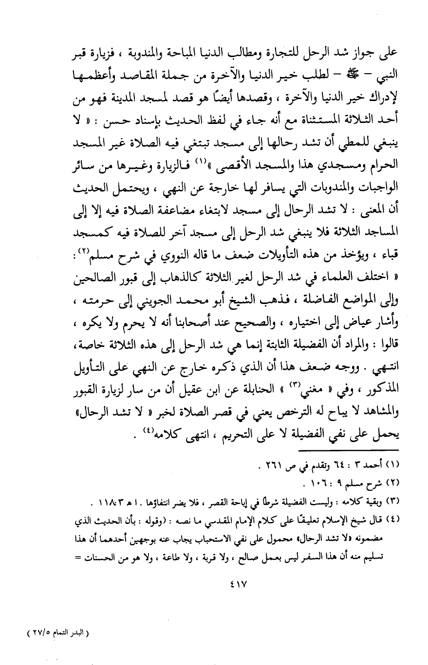 (¬4) قال شيخ الإسلام تعليقًا على كلام الإمام المقدسي ما نصه: (وقوله: بأن الحديث الذي مضمونه "لا تشد الرحال" محمول على نفي الاستحباب يجاب عنه بوجهين أحدهما أن هذا تسليم منه أن هذا السفر ليس بعمل صالح، ولا قربة، ولا طاعة، ولا هو من الحسنات =