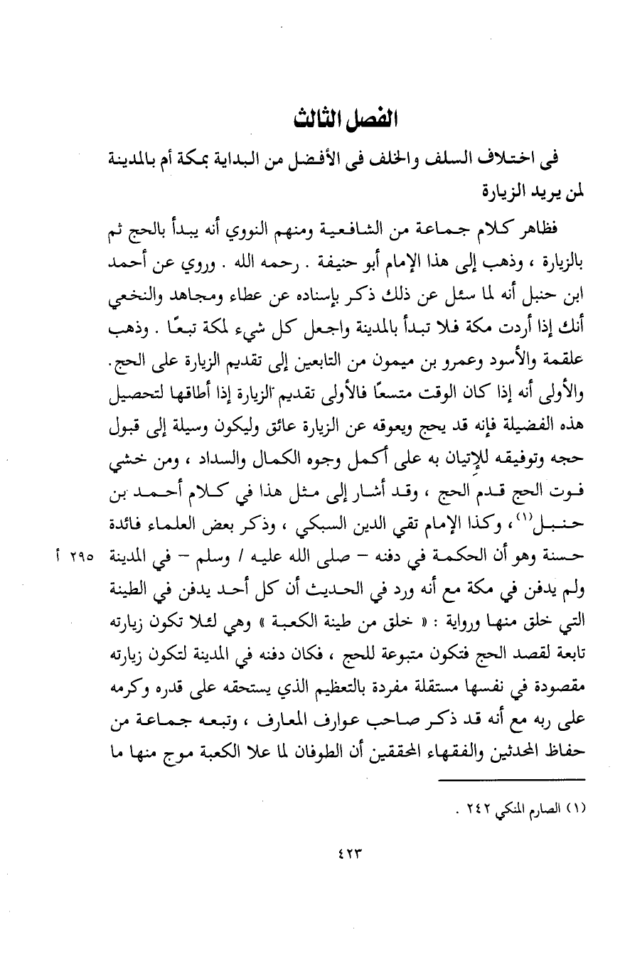 الفصل الثالث في اختلاف السلف والخلف في الأفضل من البداية بمكة أم بالمدينة لمن يريد الزيارة