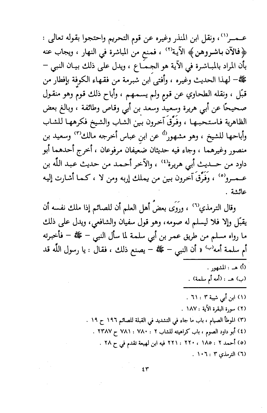 وقال التِّرمذيُّ (¬6)، ورَوَى بعض أهل العلم أن للصائم إذا ملك نفسه أن يقبّل وإلا فلا ليسلم له صومه، وهو قول سفيان والشافعي، ويدل على ذلك ما رواه مسلم من طريق عمر بن أبي سلمة لما سأل النَّبيُّ - صلى الله عليه وسلم - فأخبرته أم سلمة أمه (ب) "أن النَّبيَّ - صلى الله عليه وسلم - يصنع ذلك، فقال: يا رسول الله قد