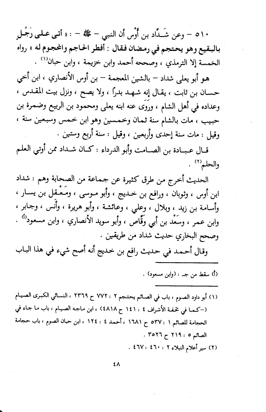 510 - وعن شَداد بن أوْس أن النَّبيَّ - صلى الله عليه وسلم -: "أتى على رَجُل بالبقيع وهو يحتجم في رمضان فقال: أفطر الحاجم والمحجوم له" رواه الخمسة إلَّا التِّرمذيّ، وصححه أحمد وابن خزيمة، وابن حبان (¬1).