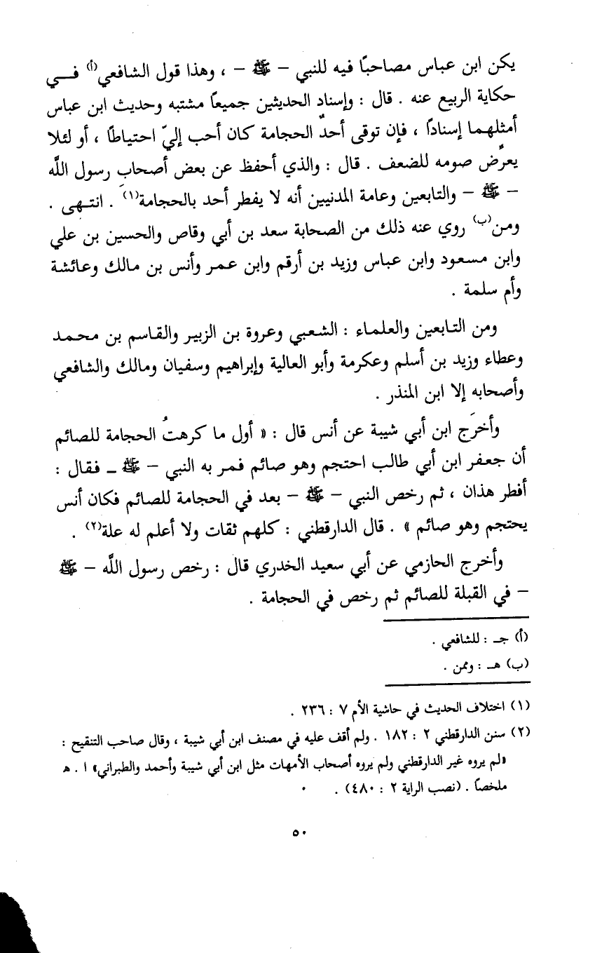 وأخرَج ابن أبي شيبة عن أنس قال: "أول ما كرهتُ الحجامة للصائم أن جعفر ابن أبي طالب احتجم وهو صائم فمر به النَّبيُّ - صلى الله عليه وسلم - فقال: أفطر هذان، ثم رخص النَّبيُّ - صلى الله عليه وسلم - بعد في الحجامة للصائم فكان أنس يحتجم وهو صائم". قال الدارقطني: كلهم ثقات ولا أعلم له علة (¬2).
