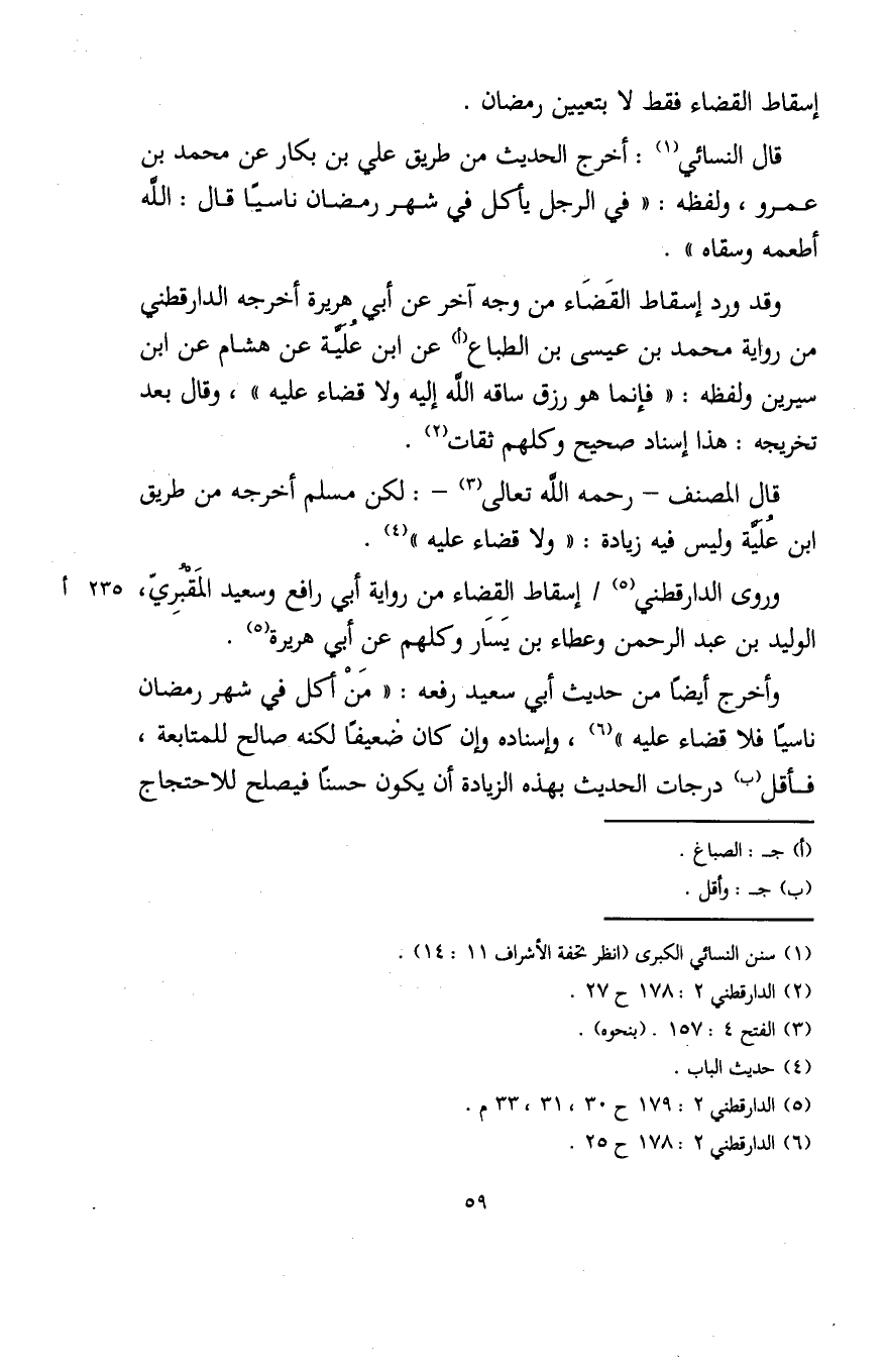وروى الدارقطني (¬5) إسقاط القضاء من رواية أبي رافع وسعيد المَقبرِيّ، الوليد بن عبد الرحمن وعطاء بن يَسَار وكلهم عن أبي هريرة (5).