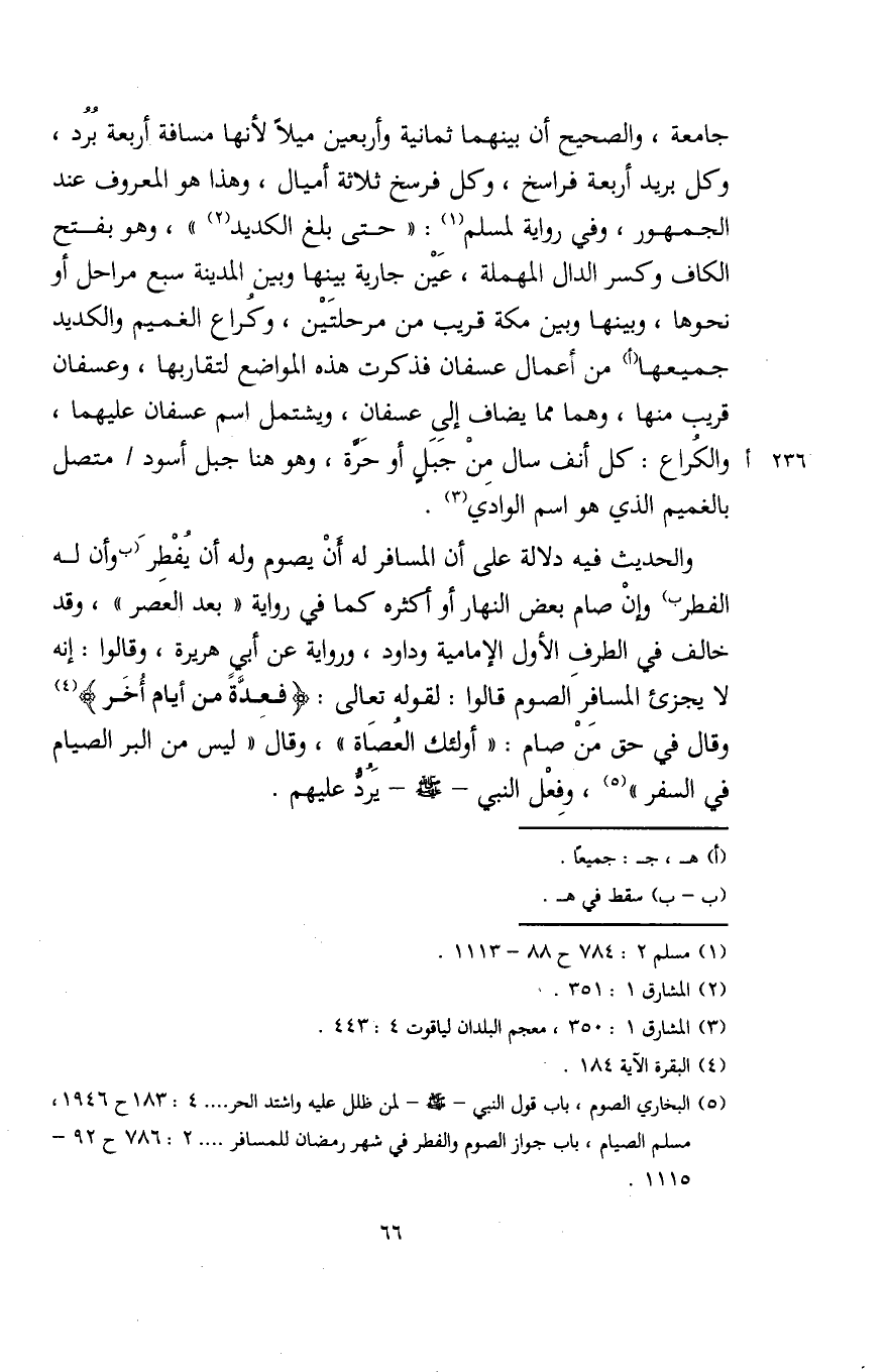جامعة، والصحيح أن بينهما ثمانية وأربعين ميلًا لأنها مسافة أربعة بُرُد، وكل بريد أربعة فراسخ، وكل فرسخ ثلاثة أميال، وهذا هو المعروف عند الجمهور، وفي رواية لمسلم (¬1): "حتَّى بلغ الكديد (¬2) "، وهو بفتح الكاف وكسر الدال المهملة، عَيْن جارية بينها وبين المدينة سبع مراحل أو نحوها، وبينها وبين مكّة قريب من مرحلتَيْن، وكراع الغميم والكديد جميعها (أ) من أعمال عسفان فذكرت هذه المواضع لتقاربها، وعسفان قريب منها، وهما ممَّا يضاف إلى عسفان، ويشتمل اسم عسفان عليهما، والكراع: كل أنف سال مِنْ جَبَلٍ أو حَرَّة، وهو هنا جبل أسود متصل بالغميم الذي هو اسم الوادي (¬3).