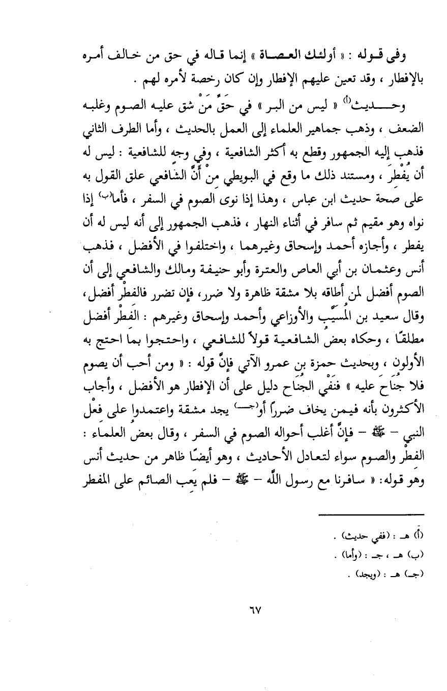 وحديث (أ) "ليس من البر" في حَقِّ مَنْ شق عليه الصوم وغلبه الضعف، وذهب جماهير العلماء إلى العمل بالحديث، وأما الطرف الثاني فذهب إليه الجمهور وقطع به أكثر الشافعية، وفي وجهٍ للشافعية: ليس له أن يُفْطِرَ، ومستند ذلك ما وقع في البويطي منْ أن الشافعي علق القول به على صحة حديث ابن عباس، وهذا إذا نوىَ الصوم في السفر، فأما (ب) إذا نواه وهو مقيم ثم سافر في أثناء النهار، فذهب الجمهور إلى أنه ليس له أن يفطر، وأجازه أحمد وإسحاق وغيرهما، واختلفوا في الأفضل، فذهب أنس وعثمان بن أبي العاص والعترة وأبو حنيفة ومالك والشافعي إلى أن الصوم أفضل لمن أطاقه بلا مشقة ظاهرة ولا ضرر، فإن تضرر فالفطرْ أفضل، وقال سعيد بن المُسيَّب والأوزاعي وأحمد وإسحاق وغيرهم: الفطرْ أفضل مطلقًا، وحكاه بعضُ الشافعية قولًا للشافعي، واحتجوا بما احتج به الأولون، وبحديث حمزة بن عمرو الآتي فإن قوله: "ومن أحب أن يصوم فلا جُنَاح عليه" فنَفْي الجُنَاح دليل على أن الإفطار هو الأفضل، وأجاب الأكثرون بأنه فيمن يخاف ضررًا أو (جـ) يجد مشقة واعتمدوا على فعْل النَّبيِّ - صلى الله عليه وسلم - فإن أغلب أحواله الصوم في السفر، وقال بعضُ العلمَاء: الفِطرْ والصوم سواء لتعادل الأحاديث، وهو أيضًا ظاهر من حديث أنس وهو قوله: "سافرنا مع رسول الله - صلى الله عليه وسلم - فلم يَعِب الصائم على المفطر