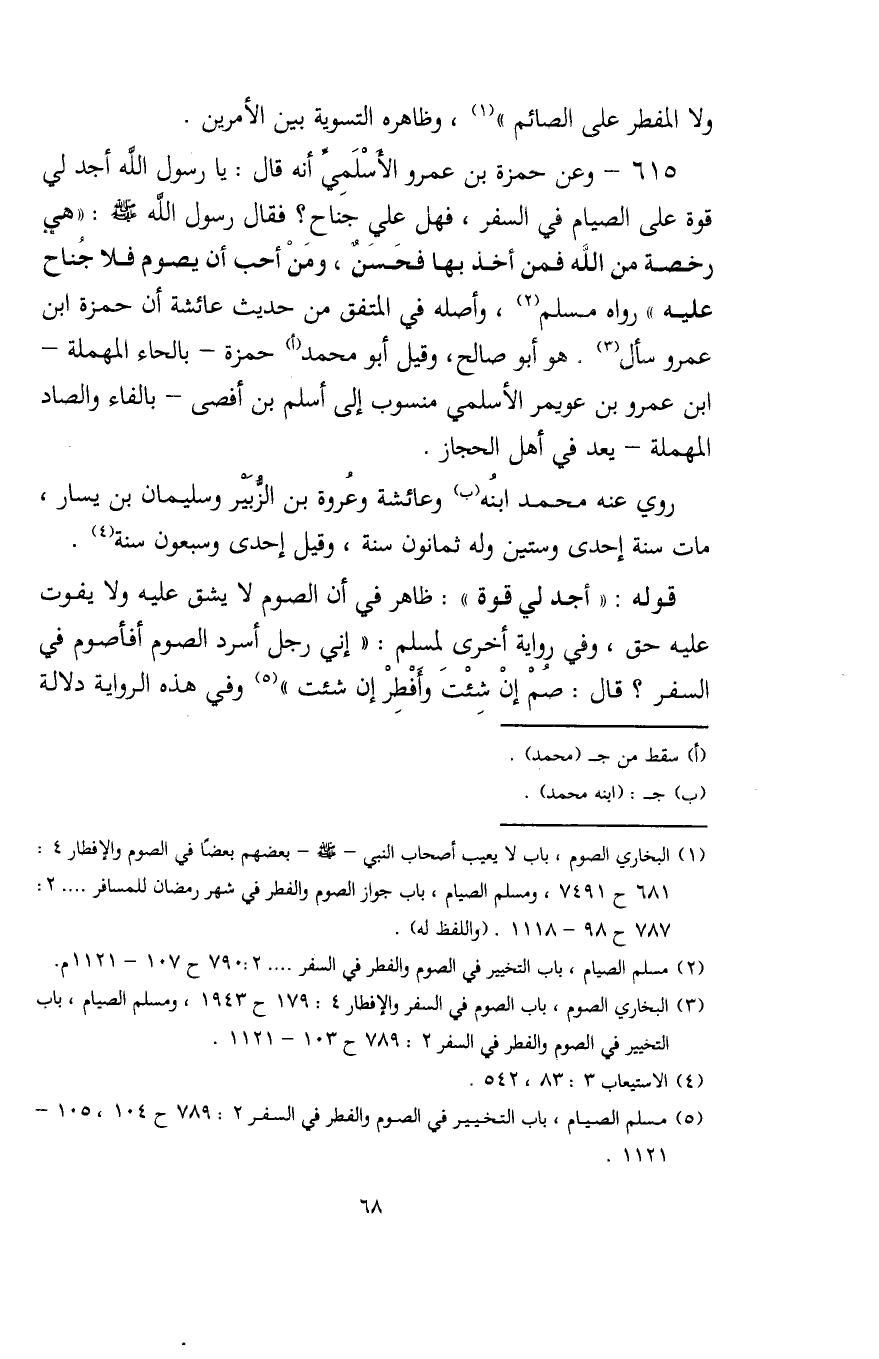 (¬1) البُخاريّ الصوم، باب لا يعيب أصحاب النَّبيِّ - صلى الله عليه وسلم - بعضهم بعضًا في الصوم والإفطار 4: 681 ح 7491، ومسلم الصيام، باب جواز الصوم والفطر في شهر رمضان للمسافر .... 2: 787 ح 98 - 1118. (واللفظ له).