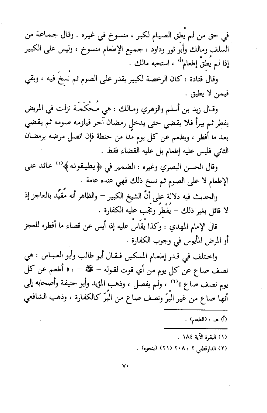 في حق من لم يُطق الصيام لكبر، منسوخ في غيره. وقال جماعة من السلف ومالك وأبو ثور وداود: جميع الإطعام منسوخ، وليس على الكبير إذا لم يُطِقْ إطعام (أ)، استحبه مالك.