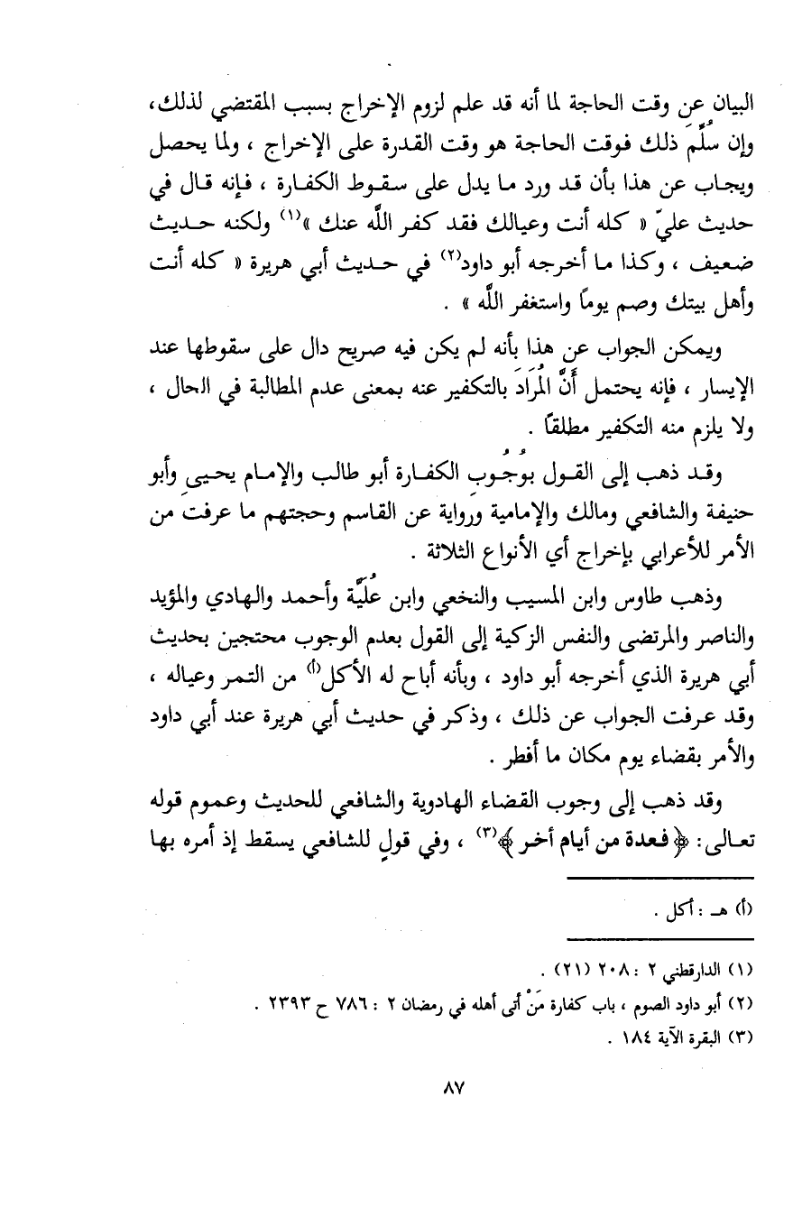 وذهب طاوس وابن المسيب والنخعي وابن عُليَّة وأحمد والهادي والمؤيد والناصر والمرتضى والنفس الزكية إلى القول بعدم الوجوب محتجين بحديث أتي هريرة الذي أخرجه أبو داود، وبأنه أباح له الأكل (أ) من التمر وعياله، وقد عرفت الجواب عن ذلك، وذكر في حديث أتي هريرة عند أبي داود والأمر بقضاء يوم مكان ما أفطر.