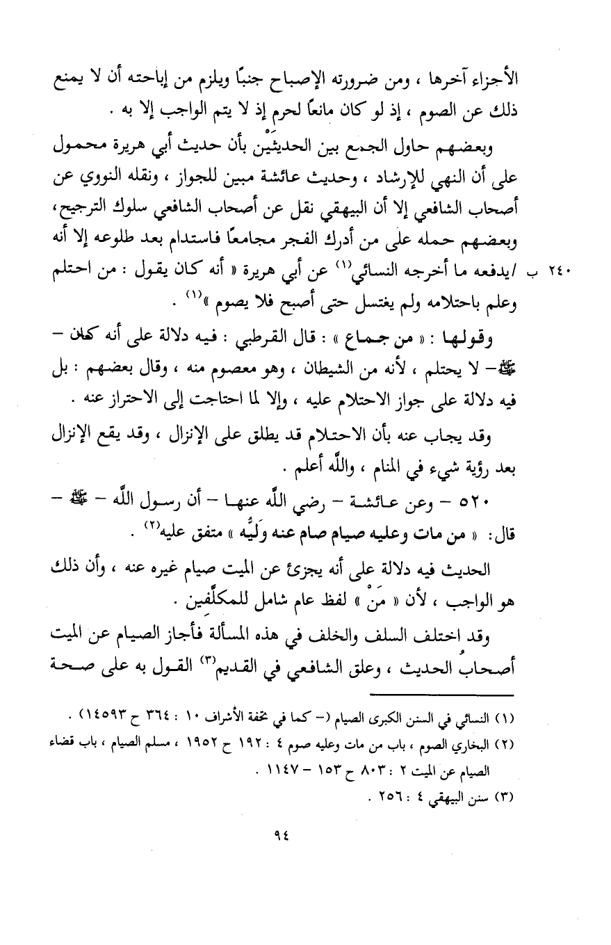 وبعضهم حاول الجمع بين الحديثين بأن حديث أبي هريرة محمول على أن النهي للإرشاد، وحديث عائشة مبين للجواز، ونقله النووي عن أصحاب الشافعي إلا أن البيهقي نقل عن أصحاب الشافعي سلوك الترجيح، وبعضهم حمله على من أدرك الفجر مجامعًا فاستدام بعد طلوعه إلا أنه يدفعه ما أخرجه النسائي (¬1) عن أبي هريرة "أنه كان يقول: من احتلم وعلم باحتلامه ولم يغتسل حتى أصبح فلا يصوم" (1).