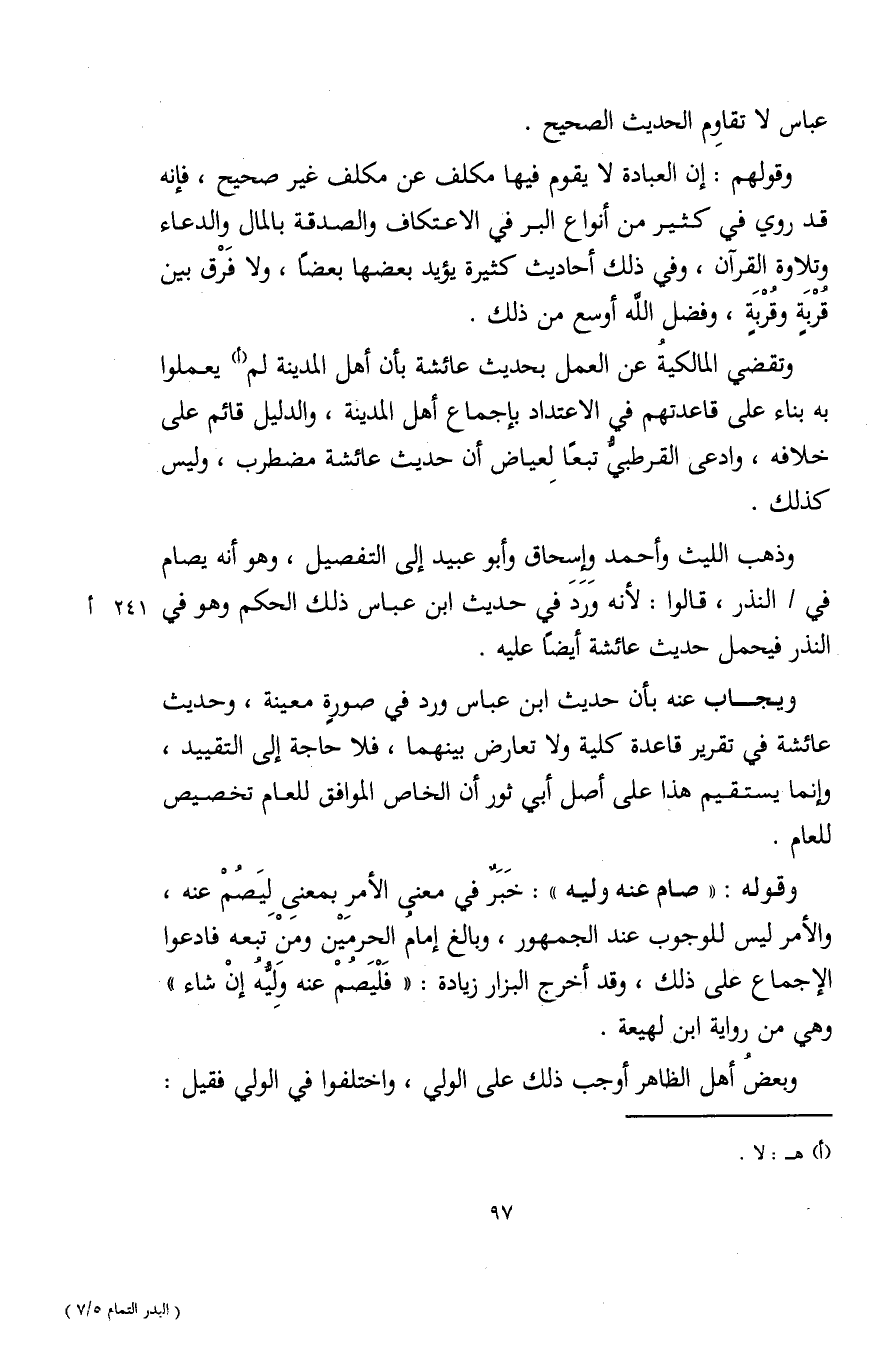 وتقضي المالكية عن العمل بحديث عائشة بأن أهل المدينة لم (أ) يعملوا به بناء على قاعدتهم في الاعتداد بإجماع أهل المدينة، والدليل قائم على خلافه، وادعى القرطبيُّ تبعًا لعياض أن حديث عائشة مضطرب، وليس كذلك.