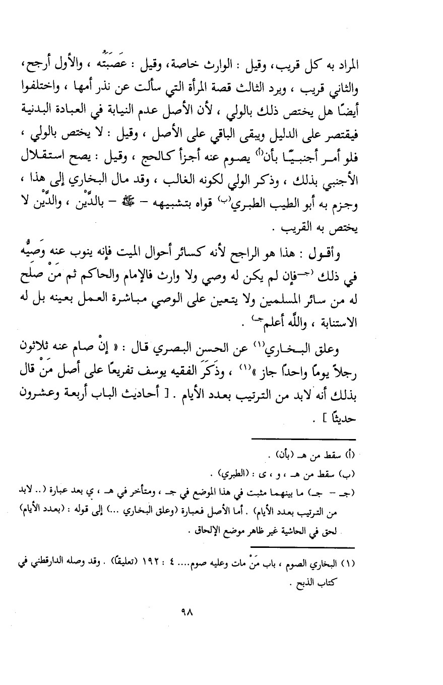 (¬1) البخاري الصوم، باب مَنْ مات وعليه صوم ... 4: 192 (تعليقًا). وقد وصله الدارقطني في كتاب الذبح.