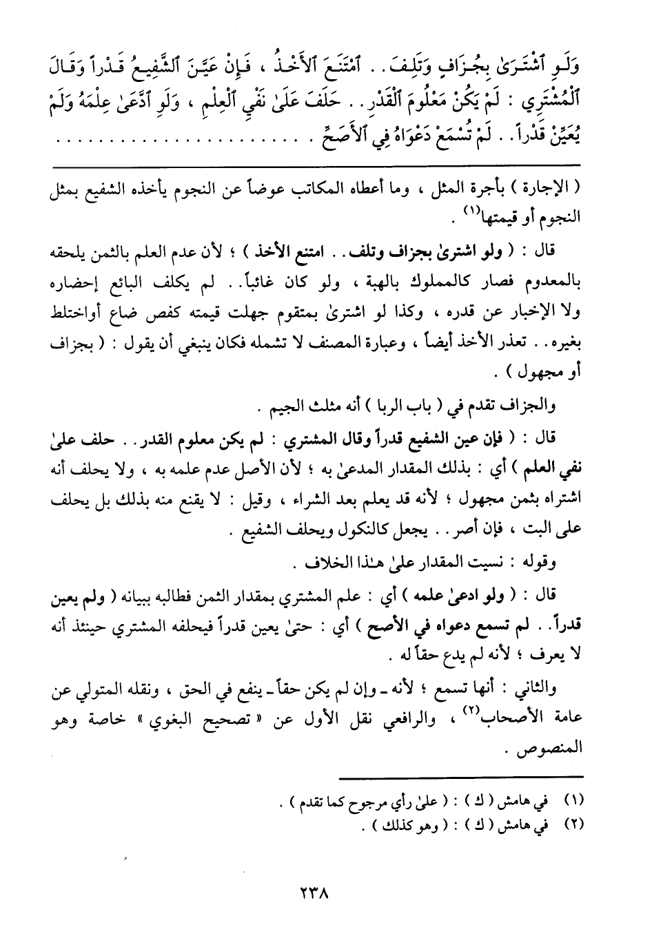 قال: (فإن عين الشفيع قدراً وقال المشتري: لم يكن معلوم القدر .. حلف على نفي العلم) أي: بذلك المقدار المدعى به؛ لأن الأصل عدم علمه به، ولا يحلف أنه اشتراه بثمن مجهول؛ لأنه قد يعلم بعد الشراء، وقيل: لا يقنع منه بذلك بل يحلف على البت، فإن أصر .. يجعل كالنكول ويحلف الشفيع.
