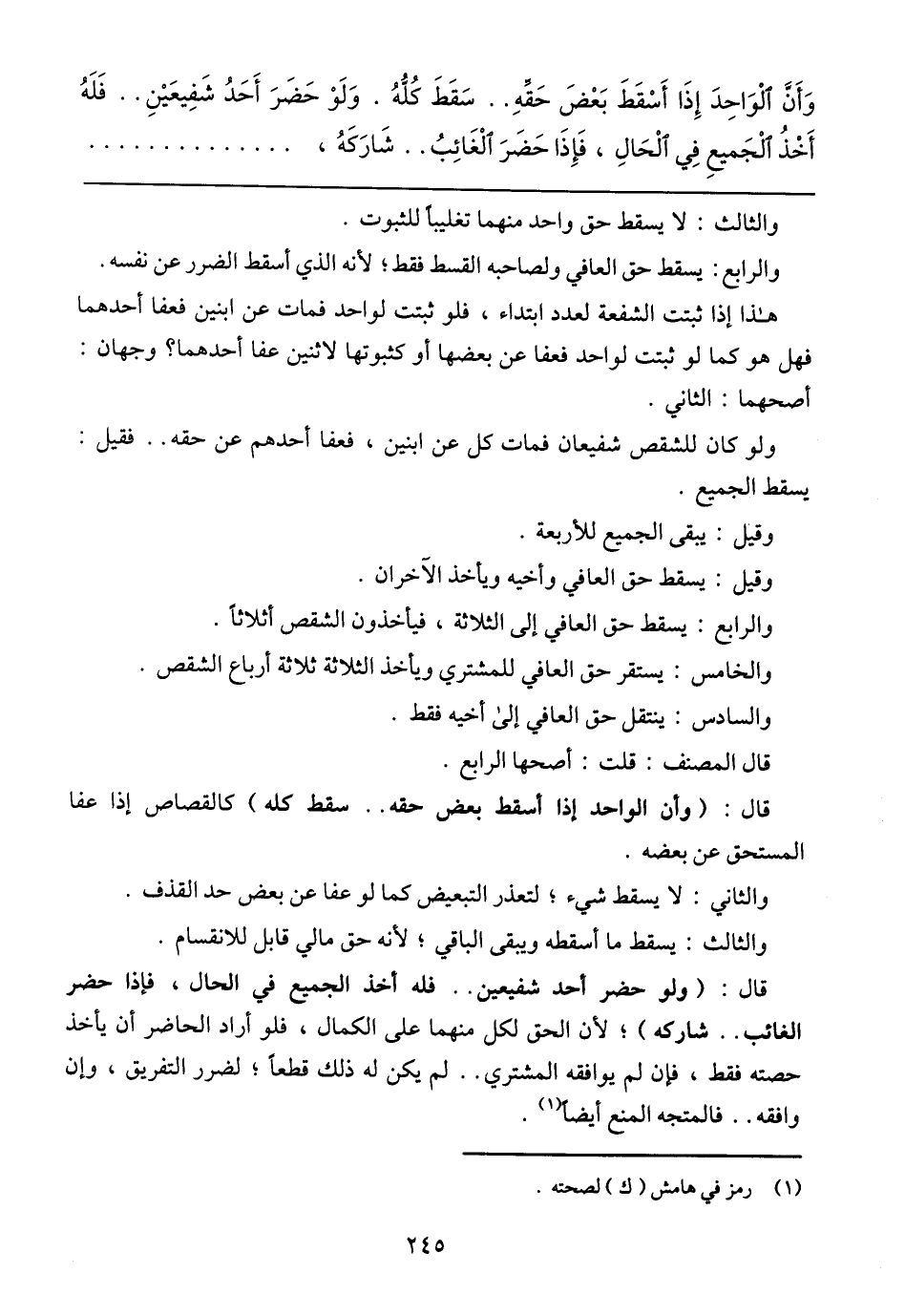 وَأَنَّ الْوَاحِدَ إِذَا أَسْقَطَ بَعْضَ حَقِّهِ .. سَقَطَ كُلُّهُ. وَلَوْ حَضَرَ أَحَدُ شَفِيعَيْنِ .. فَلَهُ أَخْذُ الْجَميعِ فِي الْحَالِ، فَإِذَا حَضَرَ الْغَائِبُ .. شَارَكَهُ،