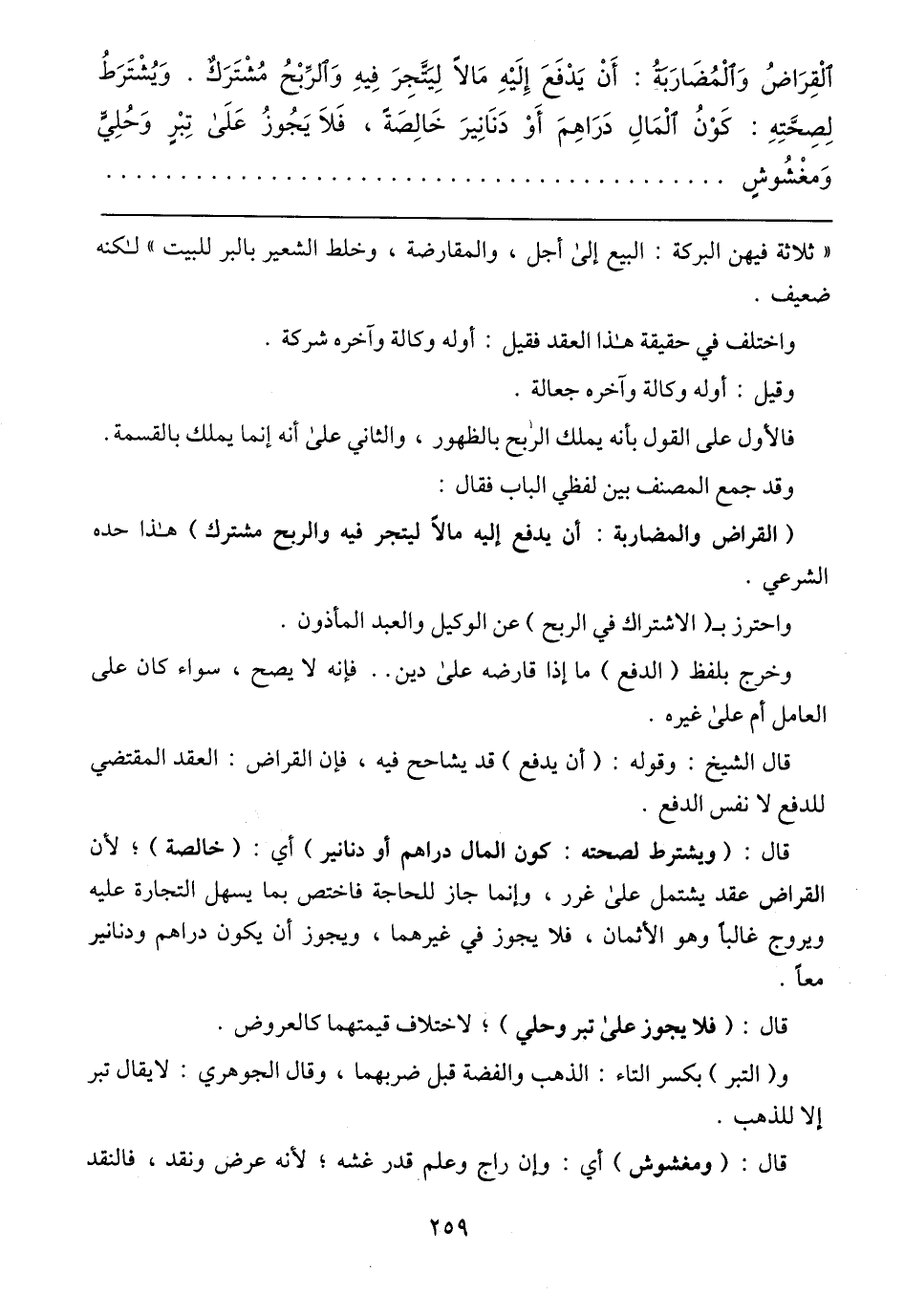 الْقِرَاضُ وَالْمُضَارَبَةُ: أَنْ يَدْفَعَ إِلَيْهِ مَالاً لِيَتَّجِرَ فِيهِ وَالرِّبْحُ مُشْتَرَكٌ. وَيُشْتَرَطُ لِصِحَّتِهِ: كَوْنُ الْمَالِ دَرَاهِمَ أَوْ دَنَانِيرَ خَالِصَةٍ، فَلاَ يَجُوزُ عَلَى تِبْرٍ وَحُلِيٍّ وَمغْشُوشٍ