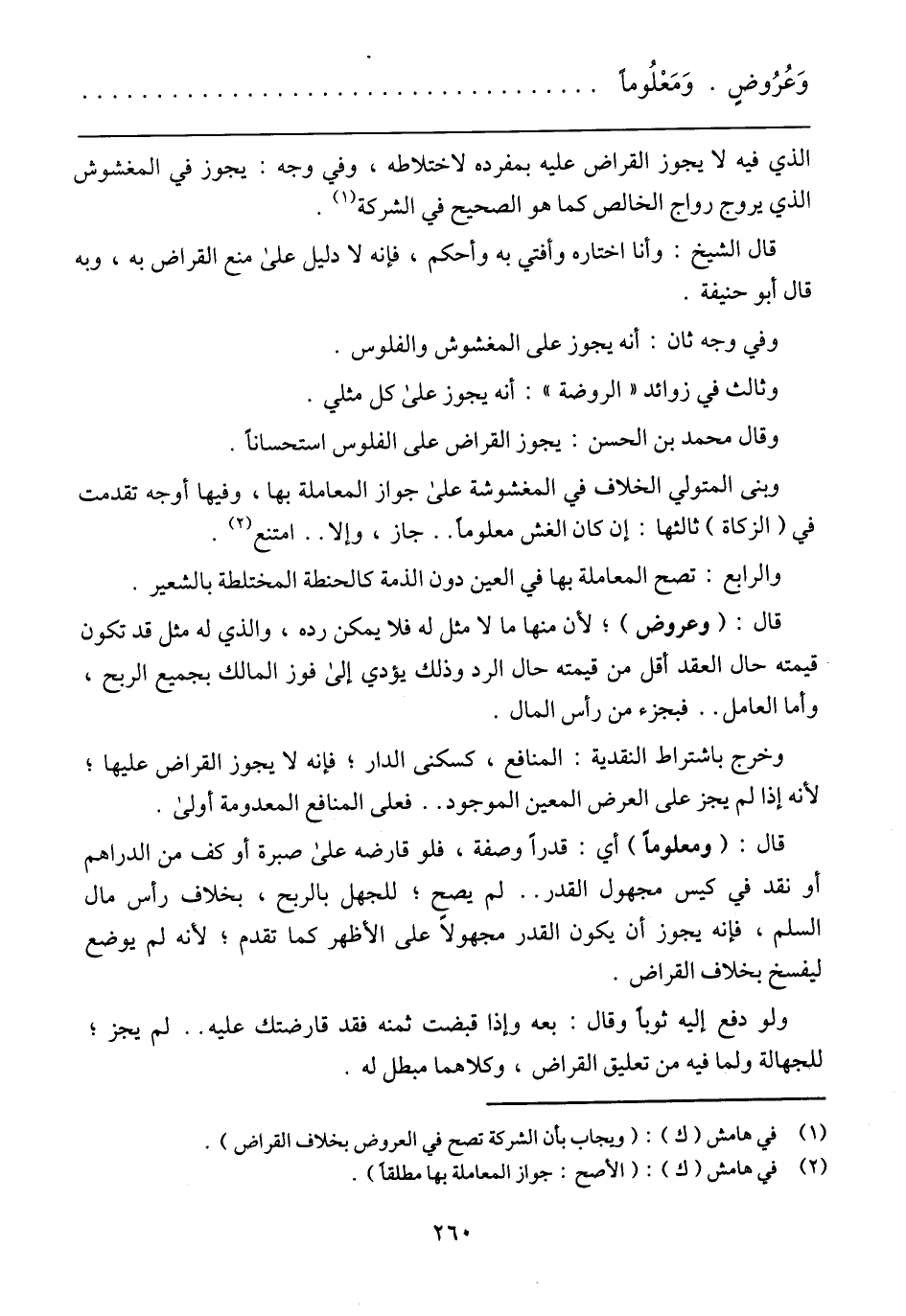 قال: (وعروض)؛ لأن منها ما لا مثل له فلا يمكن رده، والذي له مثل قد تكون قيمته حال العقد أقل من قيمته حال الرد وذلك يؤدي إلى فوز المالك بجميع الربح، وأما العامل .. فبجزء من رأس المال.