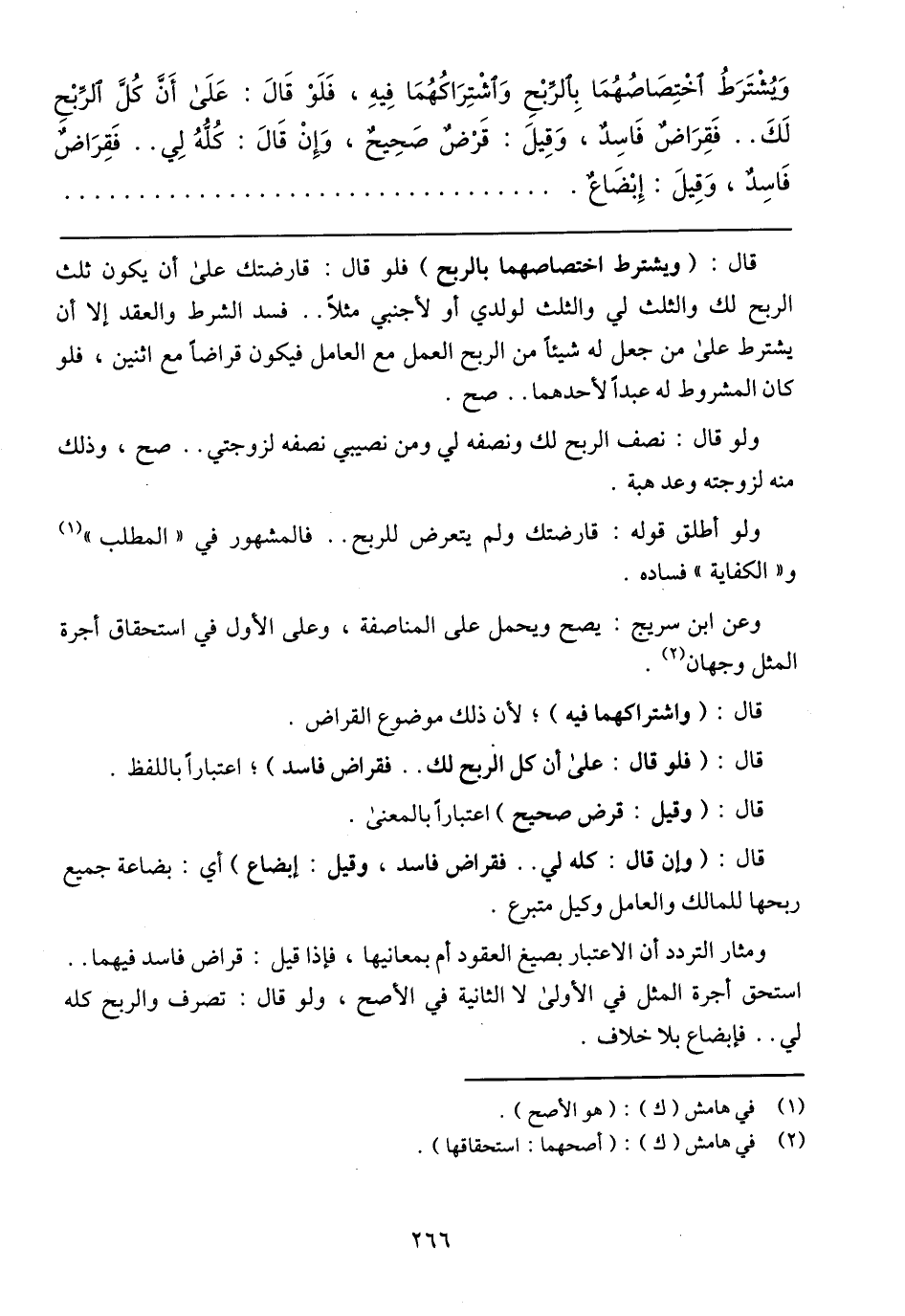 وَيُشْتَرَطُ اخْتِصَاصُهُمَا بِالرِّبْحِ وَاشْتِرَاكُهُمَا فِيهِ، فَلَوْ قَالَ: عَلَى أَنَّ كُلَّ الرِّبْحِ لَكَ .. فَقِرَاضٌ فَاسِدٌ، وَقِيلَ: قَرْضٌ صَحِيحٌ، وَإِنْ قَالَ: كُلُّهُ لِي .. فَقِرَاضٌ فَاسدٌ، وَقِيلَ: إِبْضَاعٌ.