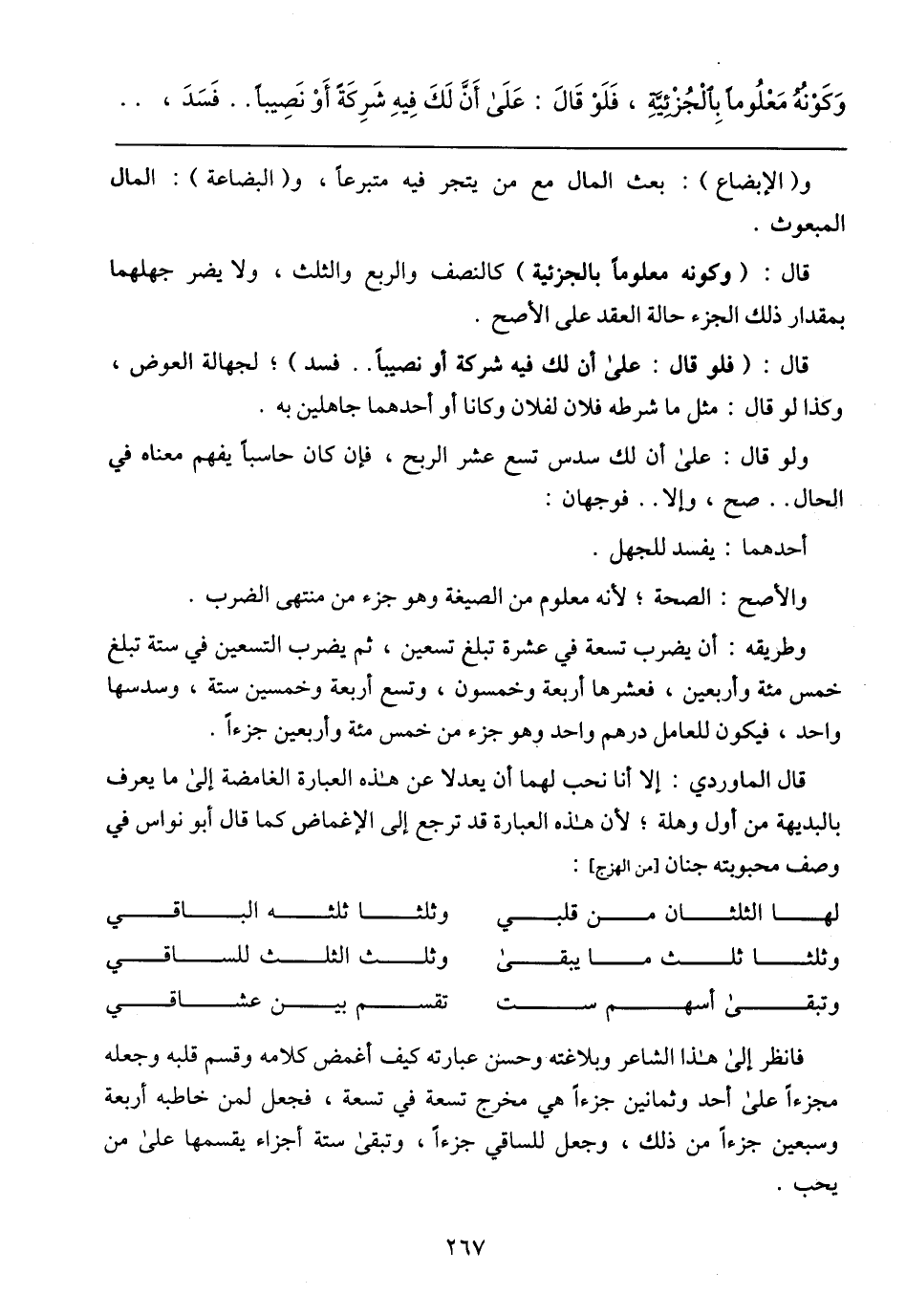 وطريقه: أن يضرب تسعة في عشرة تبلغ تسعين، ثم يضرب التسعين في ستة تبلغ خمس مئة وأربعين، فعشرها أربعة وخمسون، وتسع أربعة وخمسين ستة، وسدسها واحد، فيكون للعامل درهم واحد وهو جزء من خمس مئة وأربعين جزءاً قال الماوردي: إلا أنا نحب لهما أن يعدلا عن هذه العبارة الغامضة إلى ما يعرف بالبديهة من أول وهلة؛ لأن هذه العبارة قد ترجع إلى الإغماض كما قال أبو نواس في وصف محبوبته جنان [من الهز]: