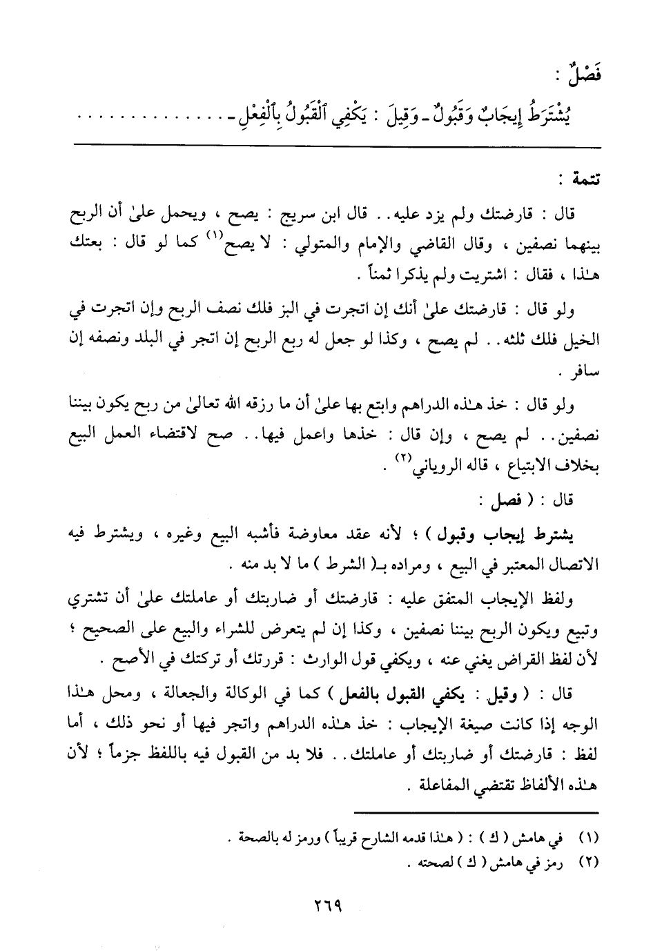 قال: (وقيل: يكفي القبول بالفعل) كما في الوكالة والجعالة، ومحل هذا الوجه إذا كانت صيغة الإيجاب: خذ هذه الدراهم واتجر فيها أو نحو ذلك، أما لفظ: قارضتك أو ضاربتك أو عاملتك .. فلابد من القبول فيه باللفظ جزماً؛ لأن هذه الألفاظ تقتضي المفاعلة.