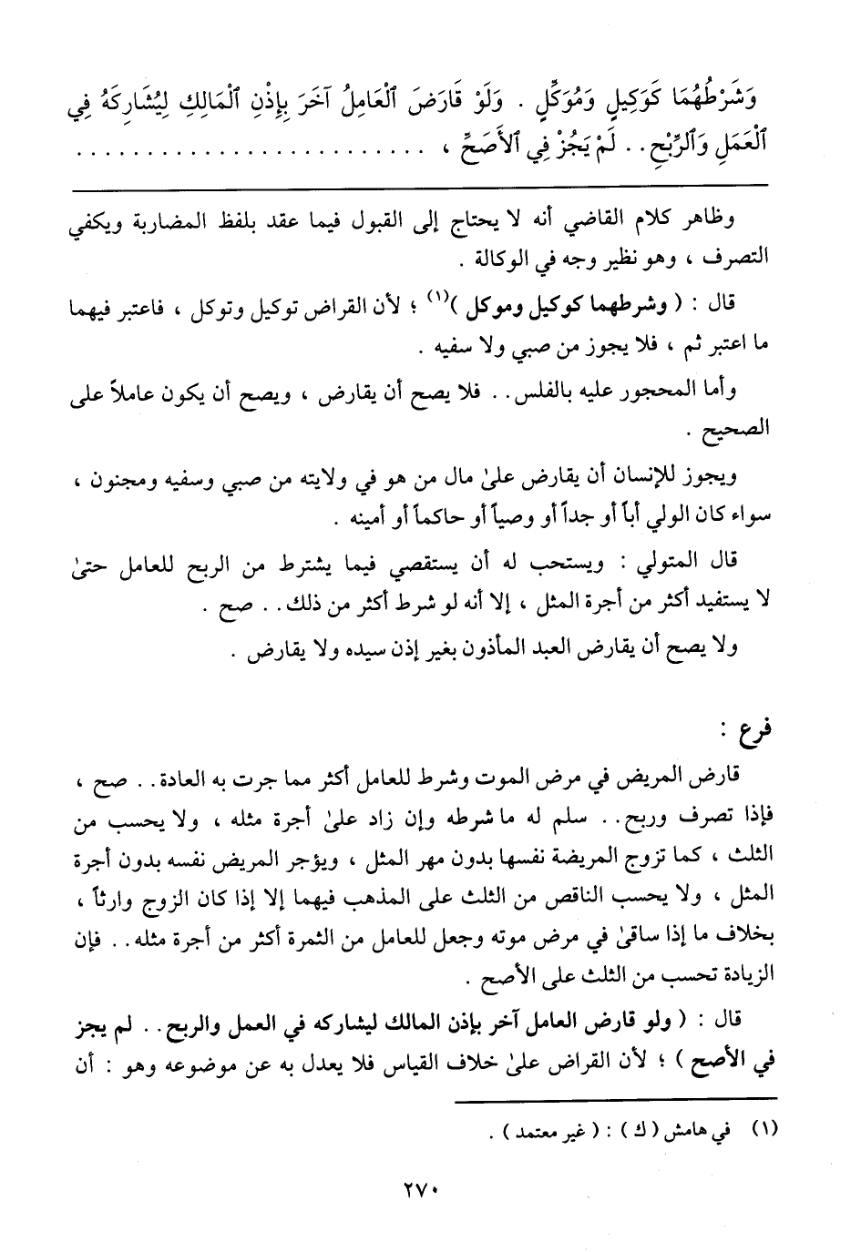 وَشَرْطُهُمَا كَوَكِيلٍ وَمُوَكِّلٍ. وَلَوْ قَارَضَ الْعَامِلُ آخَرَ بِإِذْنِ الْمَالِكِ لِيُشَارِكَهُ فِي الْعَمَلِ وَالرِّبْحِ .. لَمْ يَجُزْ فِي الأَصَحِّ،