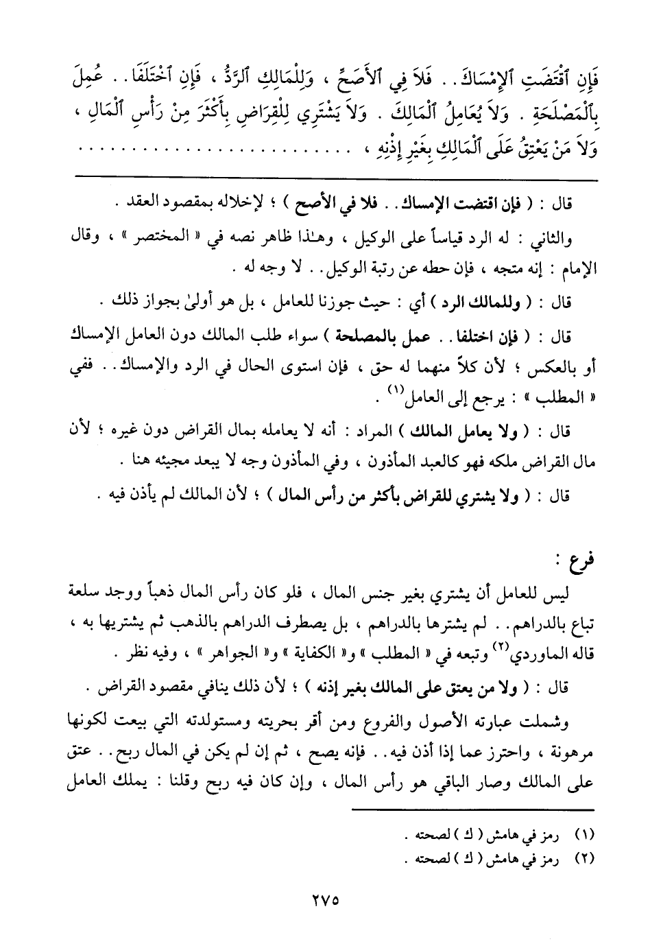 فَإِنِ اقْتَضَتِ الإِمْسَاكَ .. فَلاَ فِي الأَصَحِّ، وَلِلْمَالِكِ الرَّدُّ، فَإِنِ اخْتَلَفَا .. عُمِلَ بِالْمَصْلَحَةِ. وَلاَ يُعَامِلُ الْمَالِكَ. وَلاَ يَشْتَرِي لِلْقِرَاضِ بِأَكْثَرَ مِنْ رَاسِ الْمَالِ، وَلاَ مَنْ يَعْتِقُ عَلَى الْمَالِكِ بِغَيْرِ إِذْنِهِ،