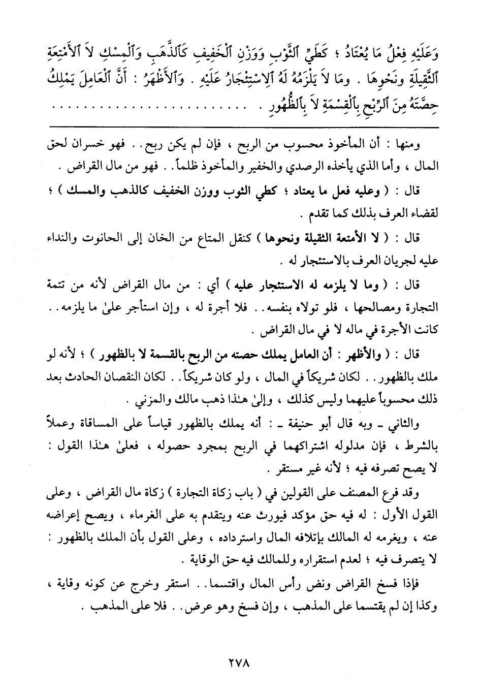 فإذا فسخ القراض ونض رأس المال واقتسما .. استقر وخرج عن كونه وقاية، وكذا إن لم يقتسما على المذهب، وإن فسخ وهو عرض .. فلا على المذهب.