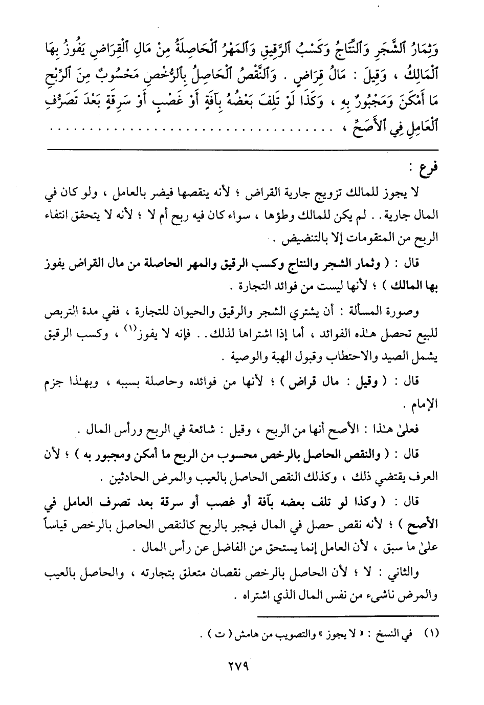 وَثِمَارُ الشَّجَرِ وَالنِّتَاجُ وَكَسْبُ الرَّقِيقِ وَالمَهْرُ الْحَاصِلَةُ مِنْ مَالِ الْقِرَاضِ يَفُوزُ بِهَا الْمَالِكُ، وَقِيلَ: مَالُ قِرَاضٍ. وَالنَّقصُ الْحَاصِلُ بِالرُّخْصِ مَحْسُوبٌ مِنَ الرِّبْحِ مَا أَمْكَنَ وَمَجْبُورٌ بِهِ، وَكَذَا لَوْ تَلِفَ بَعْضُهُ بِآفَةٍ أَوْ غَصْبٍ أَوْ سَرِقَةٍ بَعْدَ تَصَرُّفِ الْعَامِلِ فِي الأَصَحِّ،