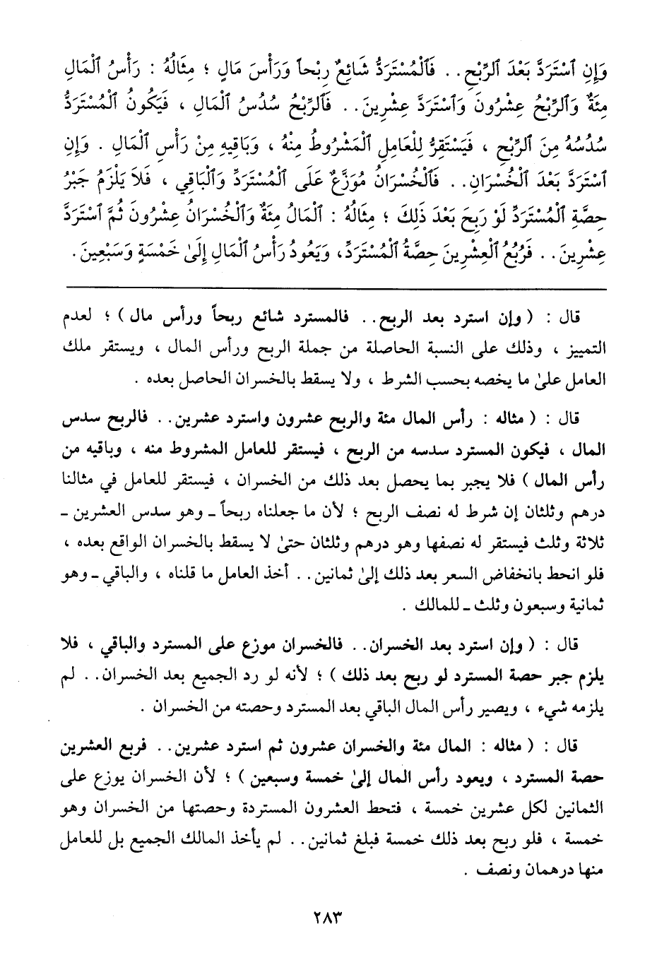 قال: (مثاله: رأس المال مئة والربح عشرون واسترد عشرين .. فالربح سدس المال، فيكون المسترد سدسه من الربح، فيستقر للعامل المشروط منه، وباقية من رأس المال) فلا يجبر بما يحصل بعد ذلك من الخسران، فيستقر للعامل في مثالنا درهم وثلثان إن شرط له نصف الربح؛ لأن ما جعلناه ربحاً- وهو سدس العشرين- ثلاثة وثلث فيستقر له نصفها وهو درهم وثلثان حتى لا يسقط بالخسران الواقع بعده، فلو انحط بانخفاض السعر بعد ذلك إلى ثمانين .. أخذ العامل ما قلناه، والباقي- وهو ثمانية وسبعون وثلث- للمالك.
