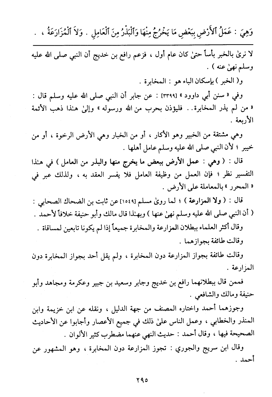 وفي (سنن أبي داوود) [3399]: عن جابر أن النبي صلى الله عليه وسلم قال: (من لم يذر المخابرة .. فليؤذن بحرب من الله ورسوله) وإلى هذا ذهب الأئمة الأربعة.