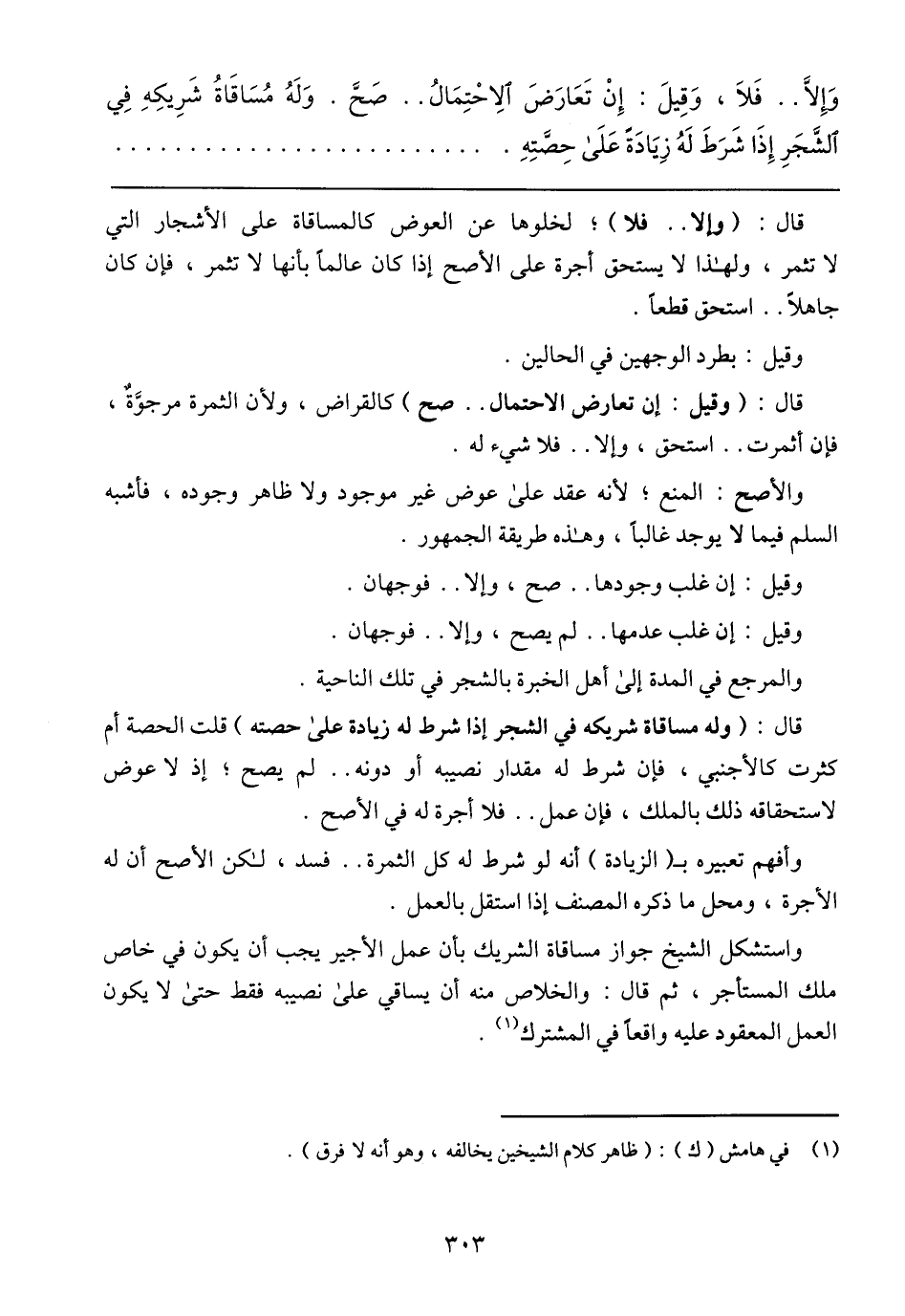 وَإِلاَّ .. فَلاَ، وَقِيلَ: إِنْ تَعَارَضَ الاِحْتِمَالُ .. صَحَّ. وَلَهُ مُسَاقَاةُ شَرِيكِهِ فِي الشَّجَرِ إِذَا شَرَطَ لَهُ زِيَادَةً عَلَى حِصَّتِهِ.