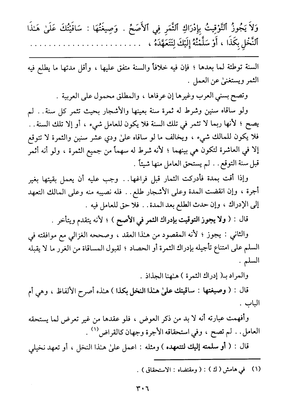 والثاني: يجوز؛ لأنه المقصود من هذا العقد، وصححه الغزالي مع موافقته في السلم على امتناع تأجيله بإدراك الثمرة أو الحصاد؛ لقبول المساقاة من الغرر ما لا يقبله السلم.