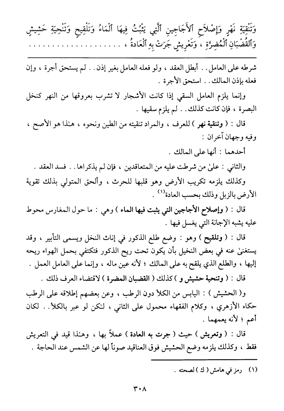 وَتَنْقِيَةِ نَهْرِ وَإِصْلاَحِ الأَجَاجِينِ الَّتِي يَثْبُتُ فِيهَا الْمَاءُ وَتلْقِيحٍ وَتَنْحِيَةِ حَشِيشٍ وَالقُضْبَانِ الْمُضِرَّةِ، وَتَعْرِيشٍ جَرَتْ بِهِ الْعَادةُ،