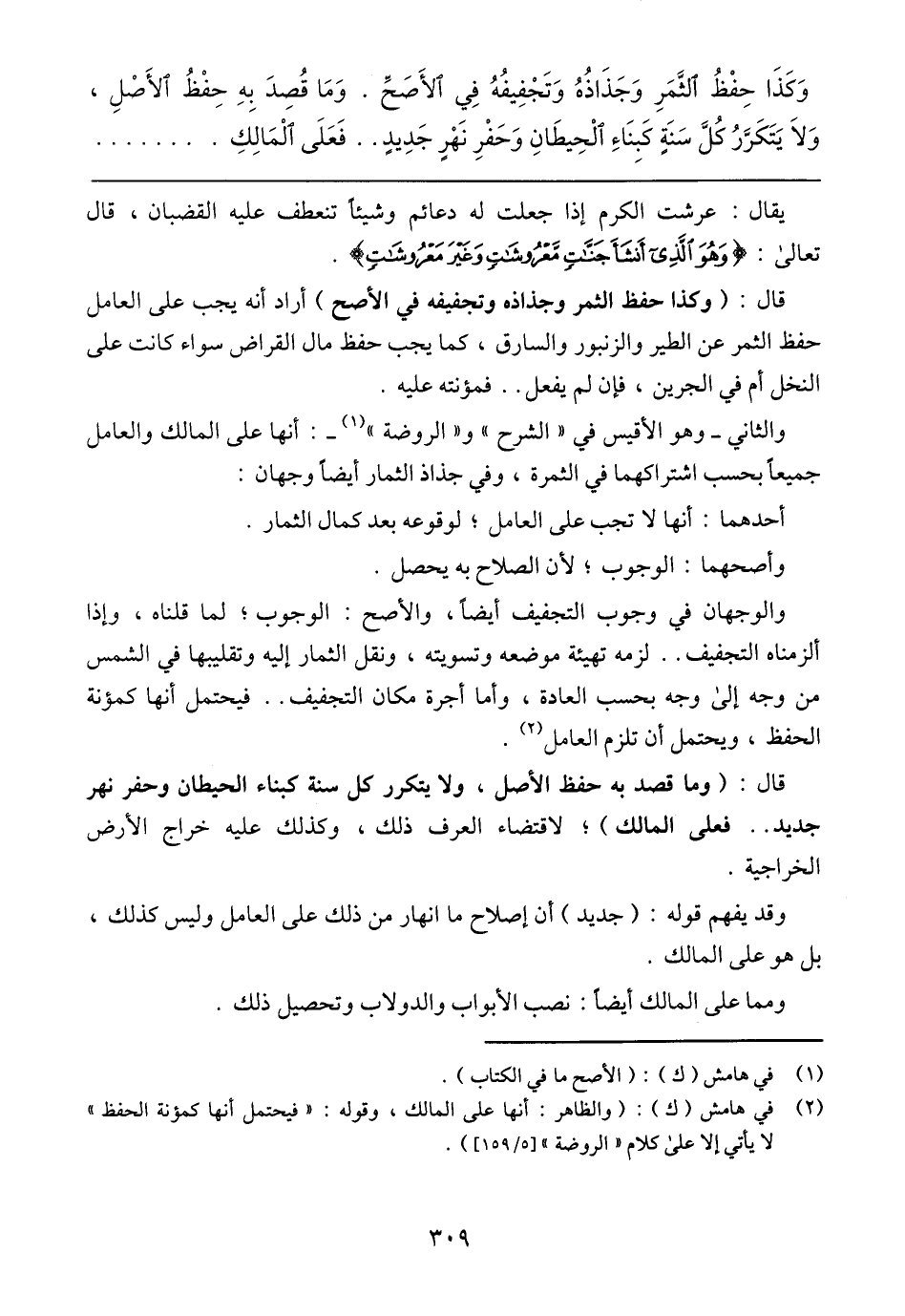 وَكَذَا حِفْظُ الثَّمَرِ وَجَذَاذُهُ وَتَجْفِيفُهُ فِي الأَصَحِّ. وَمَا قُصِدَ بِهِ حِفْظُ الأَصْلِ، وَلاَ يَتَكَرَّرُ كُلَّ سَنَةٍ كَبِنَاءِ الْحِيطَانِ وَحَفْرِ نَهْرٍ جَدِيدٍ .. فَعَلى الْمَالِكِ.