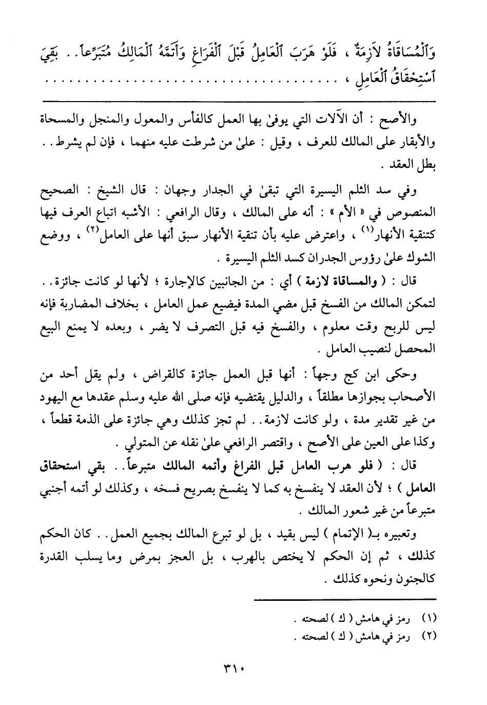 قال: (والمساقاة لازمة) أي: من الجانبين كالإجارة؛ لأنها لو كانت جائزة .. لتمكن المالك من الفسخ قبل مضي المدة فيضيع عمل العامل، بخلاف المضاربة فإنه ليس للربح وقت معلوم، والفسخ فيه قبل التصرف لا يضر، وبعده لا يمنع البيع المحصل لنصيب العامل.