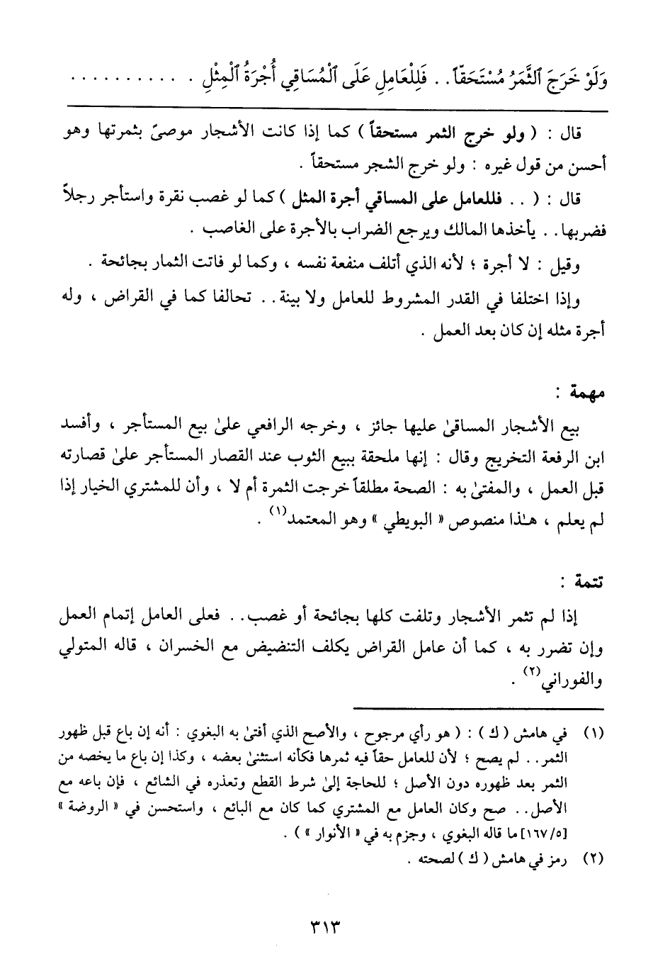 قال الرافعي: وهو أصح مما ذكره البغوي أنه إذا تلفت الثمار كلها بالجائحة .. ينفسخ العقد إلا أن يزيد بعد تمام العمل وتكامل الثمار، وإذا هلك بعضها فإن شاء العامل .. فسخ، وإن شاء .. أتم العمل وأخذ نصيبه.