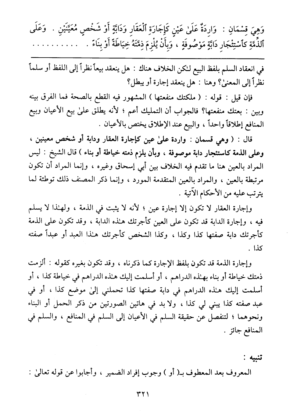 قال: (وهي قسمان: واردة على عين كإجارة العقار ودابة أو شخص معينين، وعلى الذمة كاستئجار دابة موصوفة، وبأن يلزم خياطة أو بناء) قال الشيخ: ليس المراد بالعين هنا ما تقدم فيه الخلاف بين أبي إسحاق وغيره، وإنما المراد أن تكون مرتبطة بالعين، والمراد بالعين المتقدمة المورد، وإنما ذكر المصنف ذلك توطئة لما يترتب عليه من الأحكام الآتية.