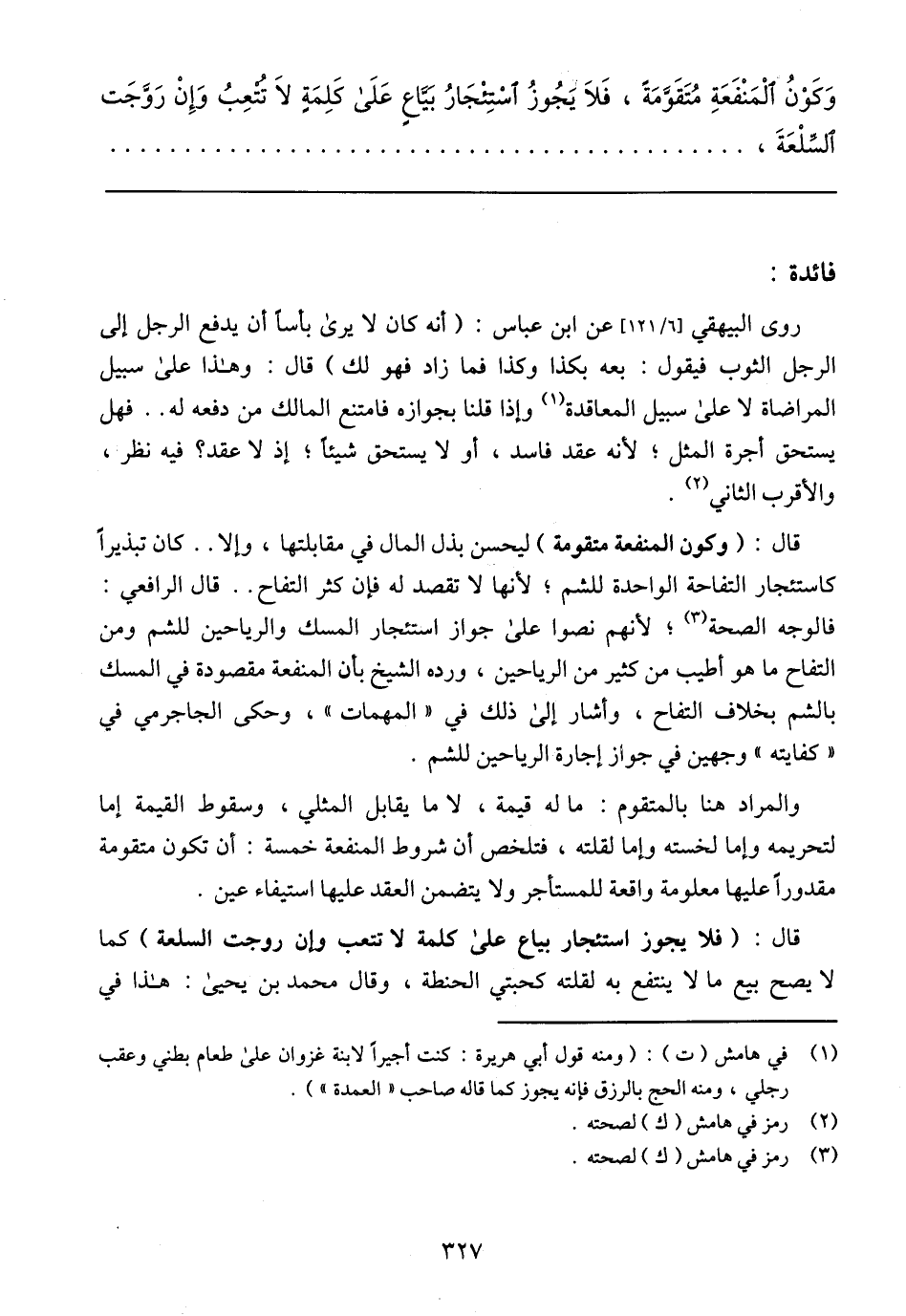 والمراد هنا بالمتقوم: ما له قيمة، لا ما يقابل المثلي، وسقوط القيمة إما لتحريمه وإما لخسته وإما لقلته، فتلخص أن شروط المنفعة خمسة: أن تكون متقومة مقدوراً عليها معلومة واقعة للمستأجر ولا يتضمن العقد عليها استيفاء عين.