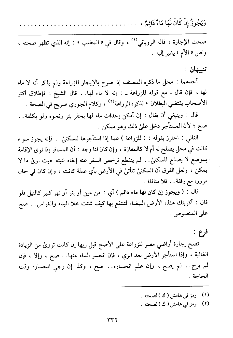 أحدهما: محل ما ذكره المصنف إذا صرح بالإيجار للزراعة ولم يذكر أنه لا ماء لها، فإن قال- مع قوله للزراعة-: إنه لا ماء لها .. قال الشيخ: فإطلاق أكثر الأصحاب يقتضي البطلان؛ لذكره الزراعة، وكلام الجوري صريح في الصحة.