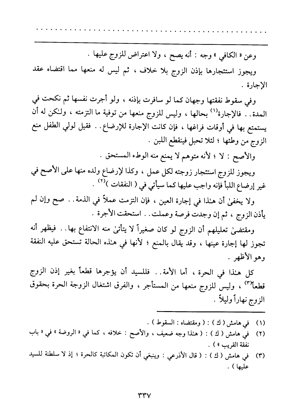 كل هذا في الحرة، أما الأمة .. فللسيد أن يؤجرها قطعاً بغير إذن الزوج قطعاً، وليس للزوج منعها من المستأجر، والفرق اشتغال الزوجة الحرة بحقوق الزوج نهاراً وليلاً.
